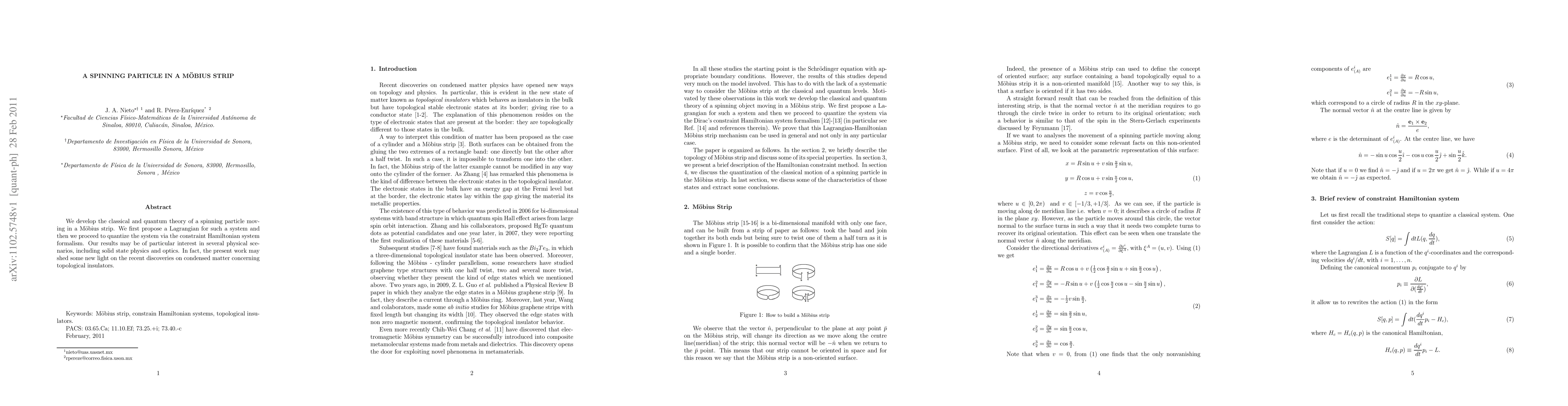 We develop the classical and quantum theory of a spinning particle moving in a Mobius strip. We first propose a Lagrangian for such a system and then we proceed to quantize the system via the constraint Hamiltonian system formalism. Our results may be of particular interest in several physical scenarios, including solid state physics and optics. In fact, the present work may shed some new light on the recent discoveries on condensed matter concerning topological insulators.