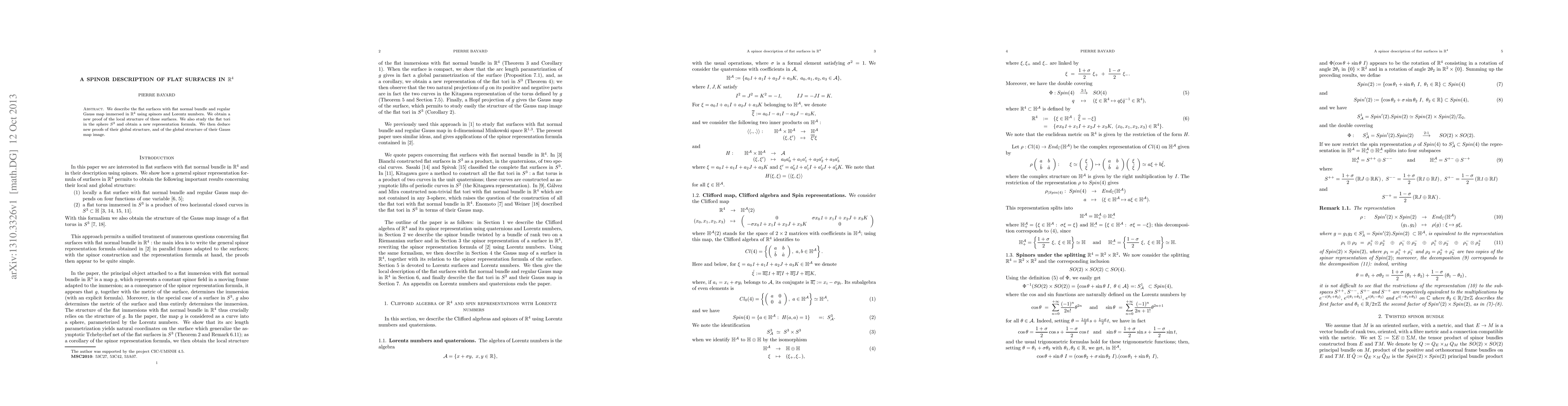 We describe the flat surfaces with flat normal bundle and regular Gauss map immersed in R^4 using spinors and Lorentz numbers. We obtain a new proof of the local structure of these surfaces. We also study the flat tori in the sphere S^3 and obtain a new representation formula. We then deduce new proofs of their global structure, and of the global structure of their Gauss map image.