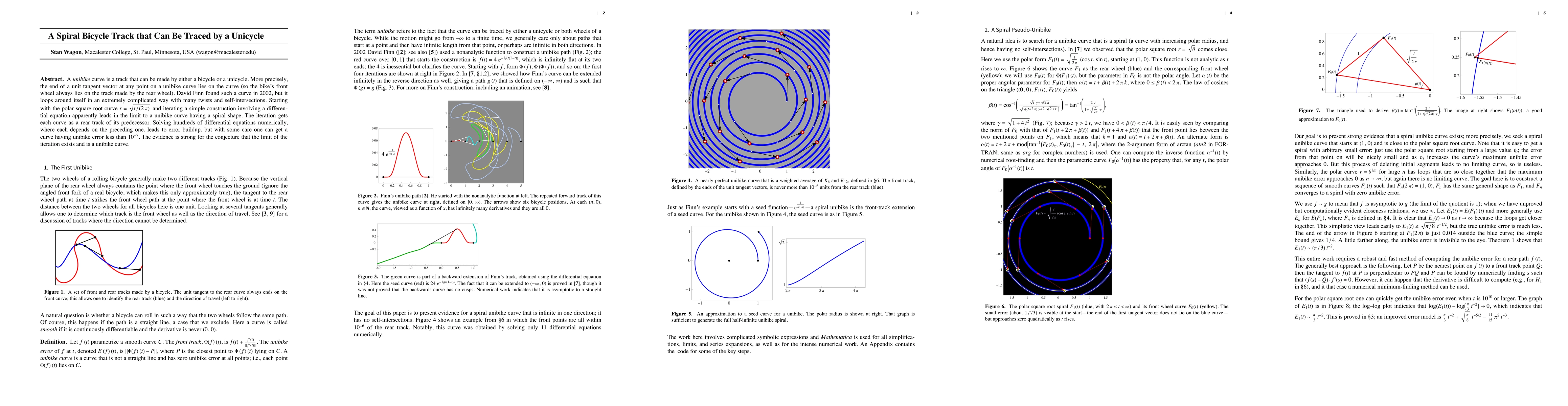 The study presents a simpler spiral unibike curve compared to Finn's original complex example, achieved through an iterative rear-track construction method, and demonstrates substantial error reduction using a simple adjustment to the initial curve.
