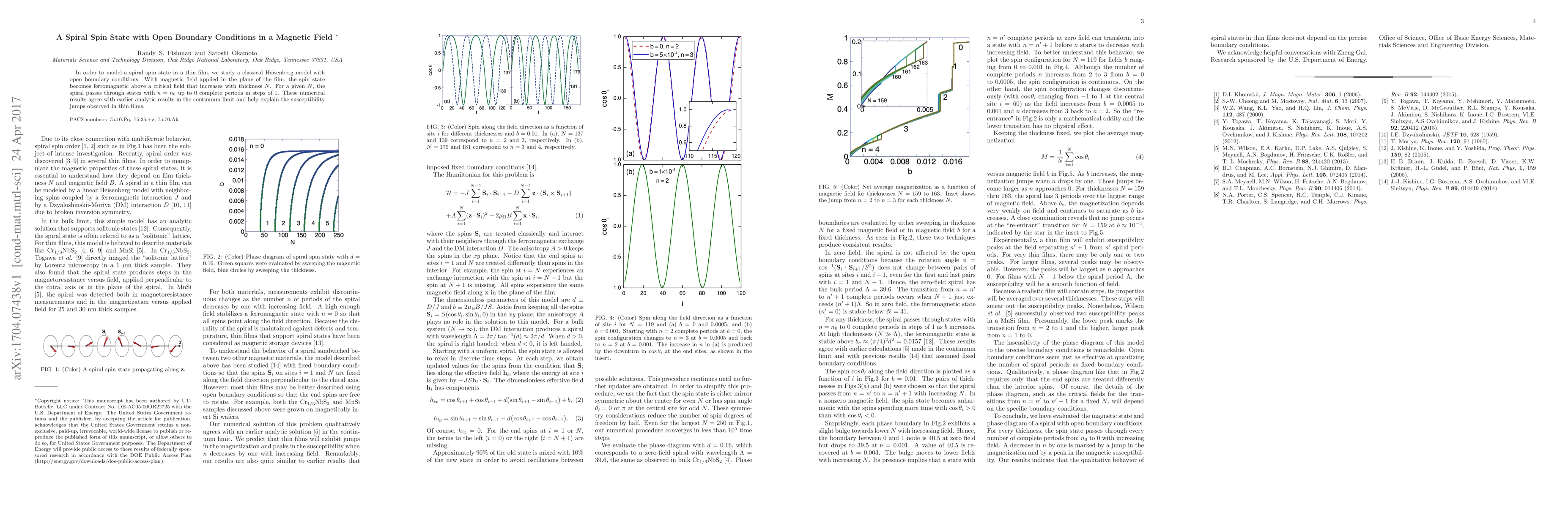 In order to model a spiral spin state in a thin film, we study a classical Heisenberg model with open boundary conditions. With magnetic field applied in the plane of the film, the spin state becomes ferromagnetic above a critical field that increases with thickness $N$. For a given $N$, the spiral passes through states with $n= n_0$ up to 0 complete periods in steps of 1. These numerical results agree with earlier analytic results in the continuum limit and help explain the susceptibility jumps observed in thin films.