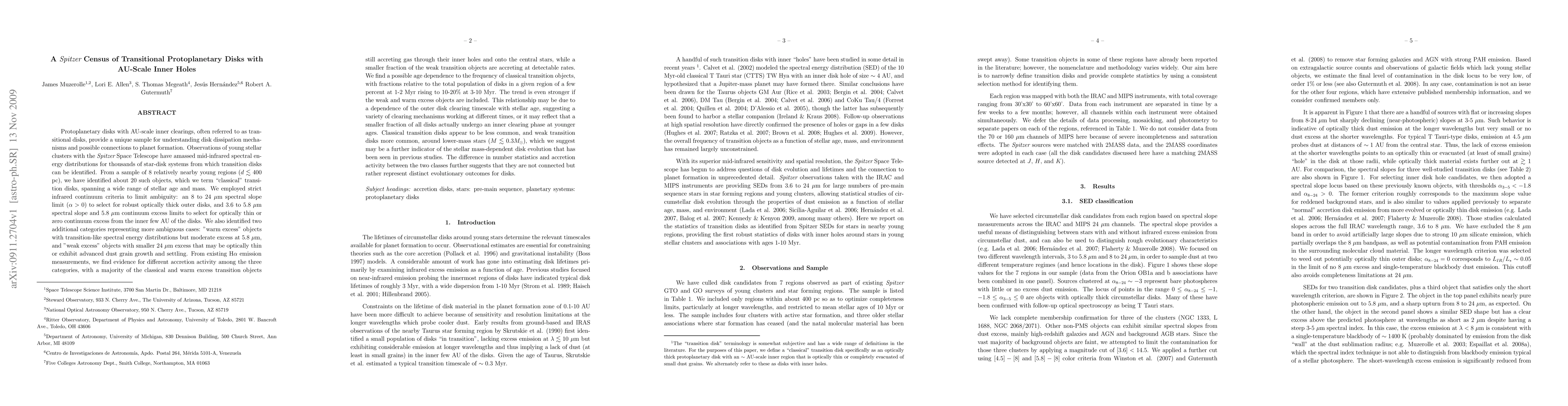 [abridged] Protoplanetary disks with AU-scale inner clearings, often referred to as transitional disks, provide a unique sample for understanding disk dissipation mechanisms and possible connections to planet formation. Observations of young stellar clusters with the Spitzer Space Telescope have amassed mid-infrared spectral energy distributions for thousands of star-disk systems from which transition disks can be identified. From a sample of 8 relatively nearby young regions (d <= 400 pc), we have identified about 20 such objects, which we term "classical" transition disks, spanning a wide range of stellar age and mass. We also identified two additional categories representing more ambiguous cases: "warm excess" objects with transition-like spectral energy distributions but moderate excess at 5.8 microns, and "weak excess" objects with smaller 24 micron excess that may be optically thin or exhibit advanced dust grain growth and settling. From existing Halpha emission measurements, we find evidence for different accretion activity among the three categories, with a majority of the classical and warm excess transition objects still accreting gas through their inner holes and onto the central stars, while a smaller fraction of the weak transition objects are accreting at detectable rates. We find a possible age dependence to the frequency of classical transition objects, with fractions relative to the total population of disks in a given region of a few percent at 1-2 Myr rising to 10-20% at 3-10 Myr. The trend is even stronger if the weak and warm excess objects are included. Classical transition disks appear to be less common, and weak transition disks more common, around lower-mass stars (M <= 0.3 Msun).
