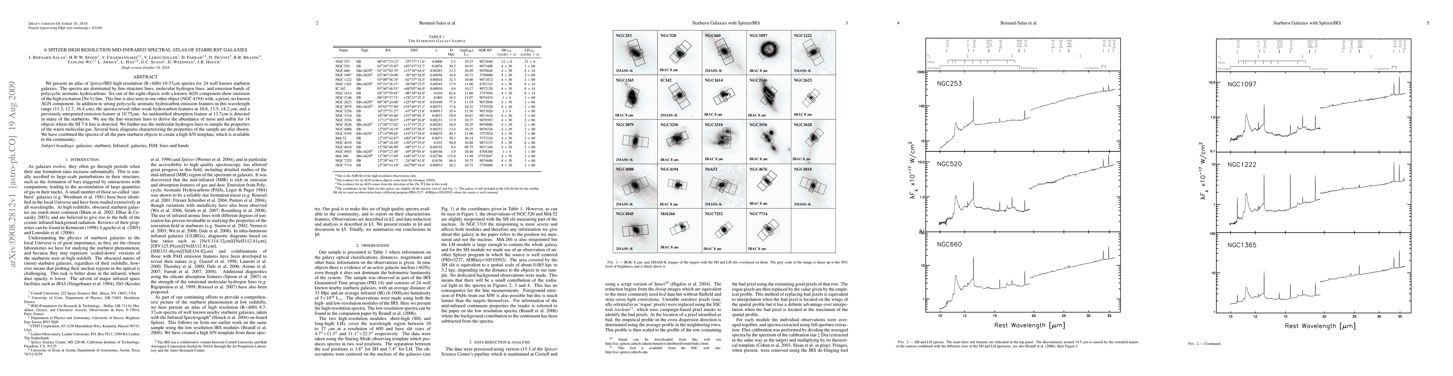 We present an atlas of Spitzer/IRS high resolution (R~600) 10-37um spectra for 24 well known starburst galaxies. The spectra are dominated by fine-structure lines, molecular hydrogen lines, and emission bands of polycyclic aromatic hydrocarbons. Six out of the eight objects with a known AGN component show emission of the high excitation [NeV] line. This line is also seen in one other object (NGC4194) with, a priori, no known AGN component. In addition to strong polycyclic aromatic hydrocarbon emission features in this wavelength range (11.3, 12.7, 16.4um), the spectra reveal other weak hydrocarbon features at 10.6, 13.5, 14.2um, and a previously unreported emission feature at 10.75um. An unidentified absorption feature at 13.7um is detected in many of the starbursts. We use the fine-structure lines to derive the abundance of neon and sulfur for 14 objects where the HI 7-6 line is detected. We further use the molecular hydrogen lines to sample the properties of the warm molecular gas. Several basic diagrams characterizing the properties of the sample are also shown. We have combined the spectra of all the pure starburst objects to create a high S/N template, which is available to the community.