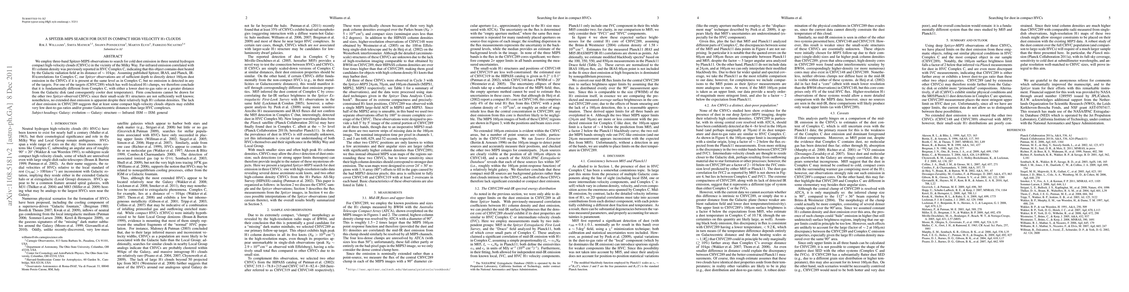 This study uses Spitzer-MIPS observations to search for cold dust in three compact high-velocity HI clouds, finding no detectable dust emission in any of them. CHVC289, in particular, appears to have a lower dust-to-gas ratio or is farther from the Galactic disk compared to HVC Complex C.