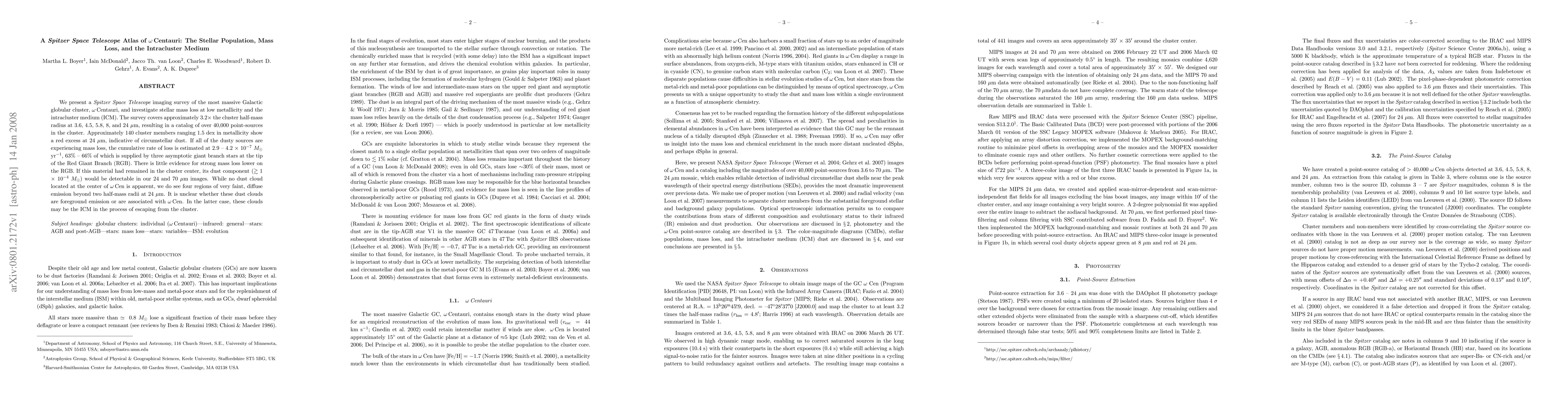 This Spitzer Space Telescope survey of omega Centauri reveals over 40,000 point-sources, with 140 cluster members showing circumstellar dust indicative of stellar mass loss, primarily from three asymptotic giant branch stars. No central dust cloud is detected, but faint, diffuse emissions suggest possible intracluster medium dust escaping the cluster.