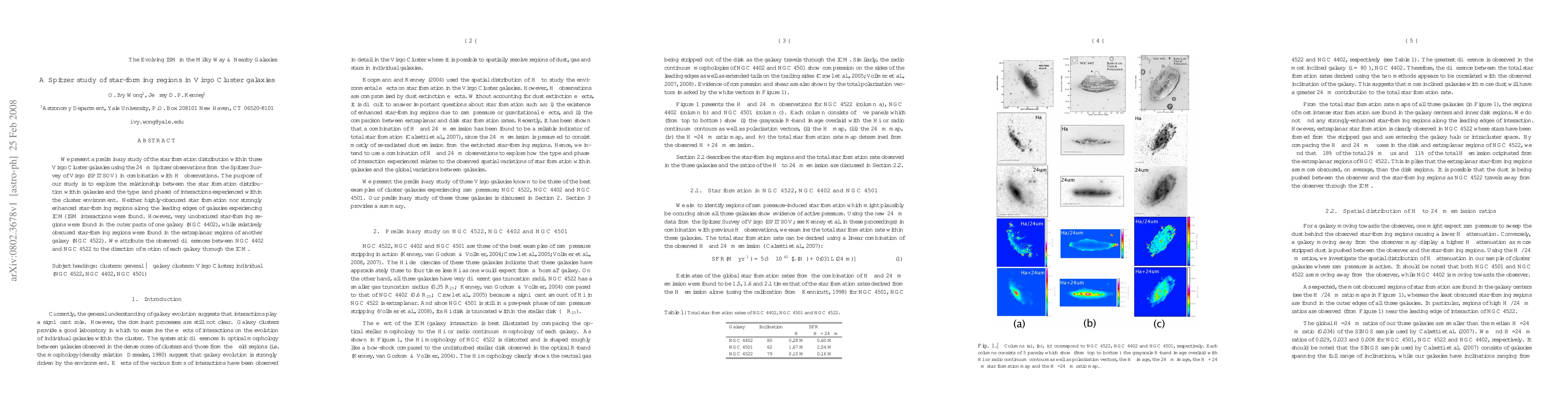 We present a preliminary study of the star formation distribution within three Virgo Cluster galaxies using the 24 micron Spitzer observations from the Spitzer Survey of Virgo (SPITSOV) in combination with H-alpha observations. The purpose of our study is to explore the relationship between the star formation distribution within galaxies and the type (and phase) of interactions experienced within the cluster environment. Neither highly-obscured star formation nor strongly enhanced star-forming regions along the leading edges of galaxies experiencing ICM-ISM interactions were found. However, very unobscured star-forming regions were found in the outer parts of one galaxy (NGC 4402), while relatively obscured star-forming regions were found in the extraplanar regions of another galaxy (NGC 4522). We attribute the observed differences between NGC 4402 and NGC 4522 to the direction of motion of each galaxy through the ICM.