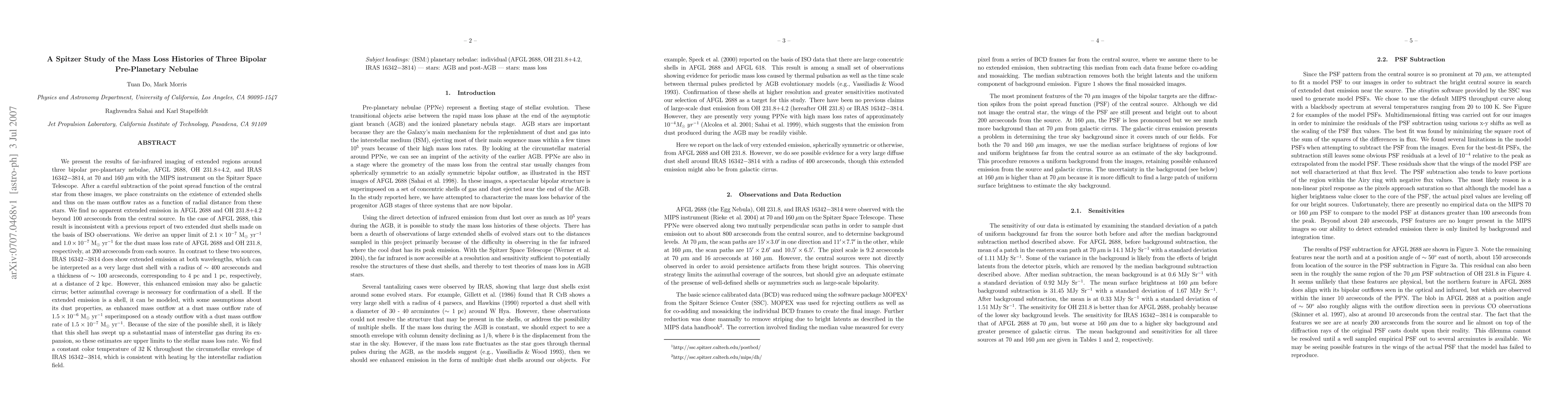 We present the results of far-infrared imaging of extended regions around three bipolar pre-planetary nebulae, AFGL 2688, OH 231.8+4.2, and IRAS 16342$-$3814, at 70 and 160 $\mu$m with the MIPS instrument on the Spitzer Space Telescope. After a careful subtraction of the point spread function of the central star from these images, we place constraints on the existence of extended shells and thus on the mass outflow rates as a function of radial distance from these stars. We find no apparent extended emission in AFGL 2688 and OH 231.8+4.2 beyond 100 arcseconds from the central source. In the case of AFGL 2688, this result is inconsistent with a previous report of two extended dust shells made on the basis of ISO observations. We derive an upper limit of $2.1\times10^{-7}$ M$_\odot$ yr$^{-1}$ and $1.0\times10^{-7}$ M$_\odot$ yr$^{-1}$ for the dust mass loss rate of AFGL 2688 and OH 231.8, respectively, at 200 arcseconds from each source. In contrast to these two sources, IRAS 16342$-$3814 does show extended emission at both wavelengths, which can be interpreted as a very large dust shell with a radius of $\sim$ 400 arcseconds and a thickness of $\sim$ 100 arcseconds, corresponding to 4 pc and 1 pc, respectively, at a distance of 2 kpc. However, this enhanced emission may also be galactic cirrus; better azimuthal coverage is necessary for confirmation of a shell. If the extended emission is a shell, it can be modeled as enhanced mass outflow at a dust mass outflow rate of $1.5\times10^{-6}$ M$_\odot$ yr$^{-1}$ superimposed on a steady outflow with a dust mass outflow rate of $1.5\times10^{-7}$ M$_\odot$ yr$^{-1}$. It is likely that this shell has swept up a substantial mass of interstellar gas during its expansion, so these estimates are upper limits to the stellar mass loss rate.