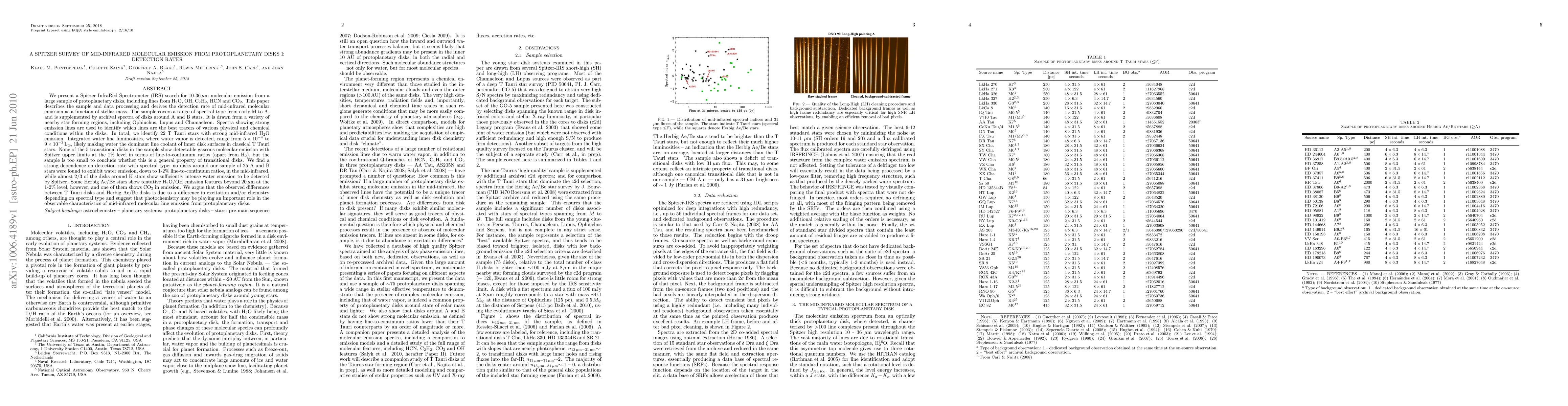 This Spitzer survey identifies mid-infrared molecular emission from protoplanetary disks, finding strong H2O emission in T Tauri stars but none in A and B stars. The detection rate correlates strongly with stellar mass, suggesting photochemistry's role in mid-infrared molecular emission differences.