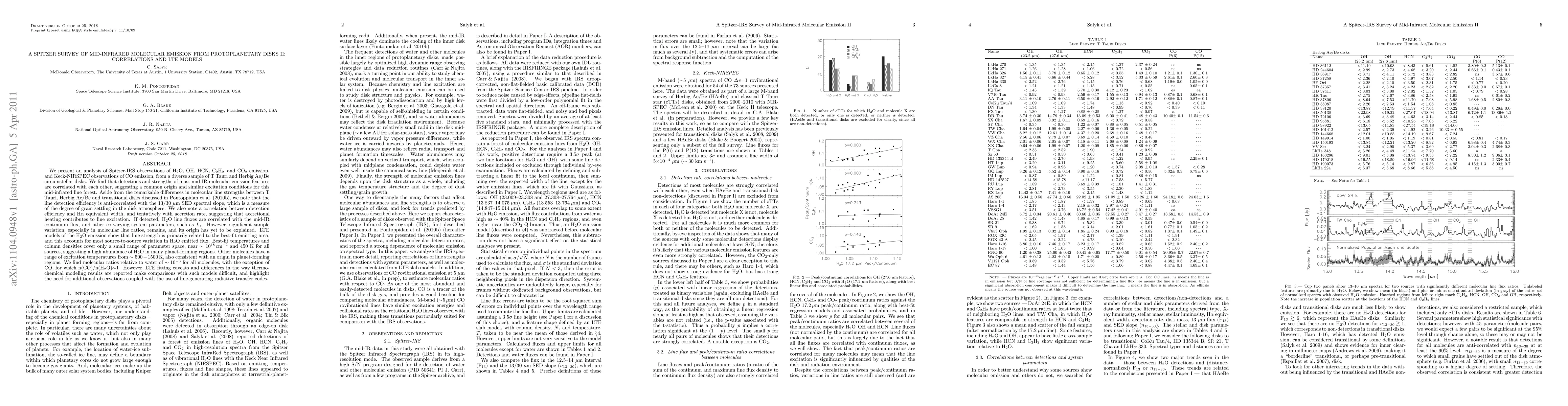 This paper analyzes Spitzer and Keck observations of mid-IR molecular emissions from protoplanetary disks, finding correlations among emission features suggesting common excitation conditions. LTE models indicate H2O line strengths are mainly due to the emitting area, while other molecules show varied excitation temperatures, hinting at diverse origins in planet-forming regions.