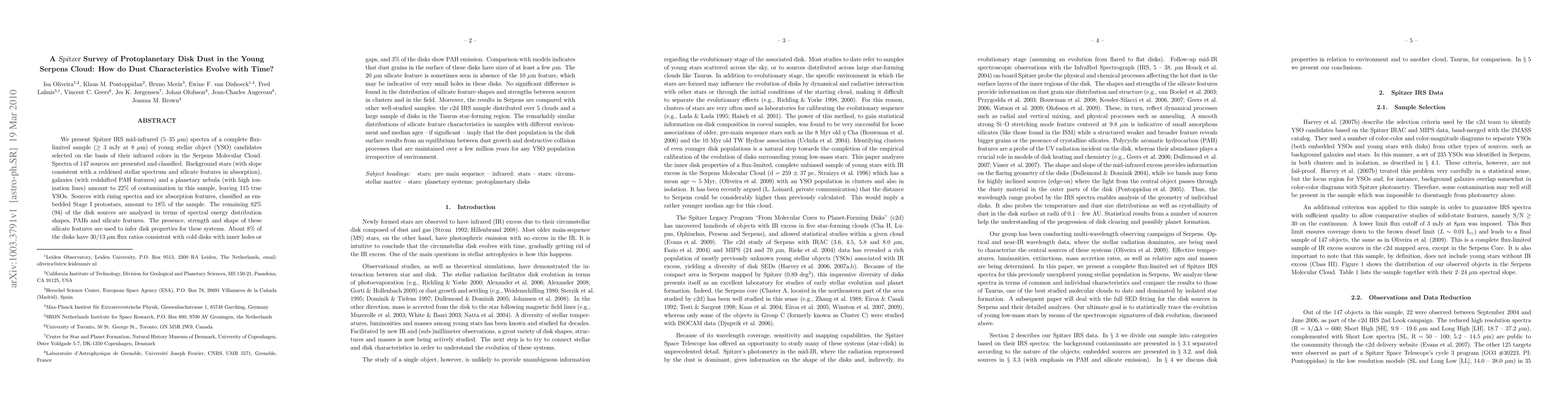 We present Spitzer IRS mid-infrared (5-35 micron) spectra of a complete flux-limited sample (> 3 mJy at 8 micron) of young stellar object (YSO) candidates selected on the basis of their infrared colors in the Serpens Molecular Cloud. Spectra of 147 sources are presented and classified. Background stars (with slope consistent with a reddened stellar spectrum and silicate features in absorption), galaxies (with redshifted PAH features) and a planetary nebula (with high ionization lines) amount to 22% of contamination in this sample, leaving 115 true YSOs. Sources with rising spectra and ice absorption features, classified as embedded Stage I protostars, amount to 18% of the sample. The remaining 82% (94) of the disk sources are analyzed in terms of spectral energy distribution shapes, PAHs and silicate features. The presence, strength and shape of these silicate features are used to infer disk properties for these systems. About 8% of the disks have 30/13 micron flux ratios consistent with cold disks with inner holes or gaps, and 3% of the disks show PAH emission. Comparison with models indicates that dust grains in the surface of these disks have sizes of at least a few \mu\m. The 20 micron silicate feature is sometimes seen in absence of the 10 micron feature, which may be indicative of very small holes in these disks. No significant difference is found in the distribution of silicate feature shapes and strengths between sources in clusters and in the field. Moreover, the results in Serpens are compared with other well-studied samples: the c2d IRS sample distributed over 5 clouds and a large sample of disks in the Taurus star-forming region. The remarkably similar distributions of silicate feature characteristics in samples with different environment and median ages - if significant - imply that the dust population in the disk surface results from an equilibrium between dust growth and destructive collision processes that are maintained over a few million years for any YSO population irrespective of environment.