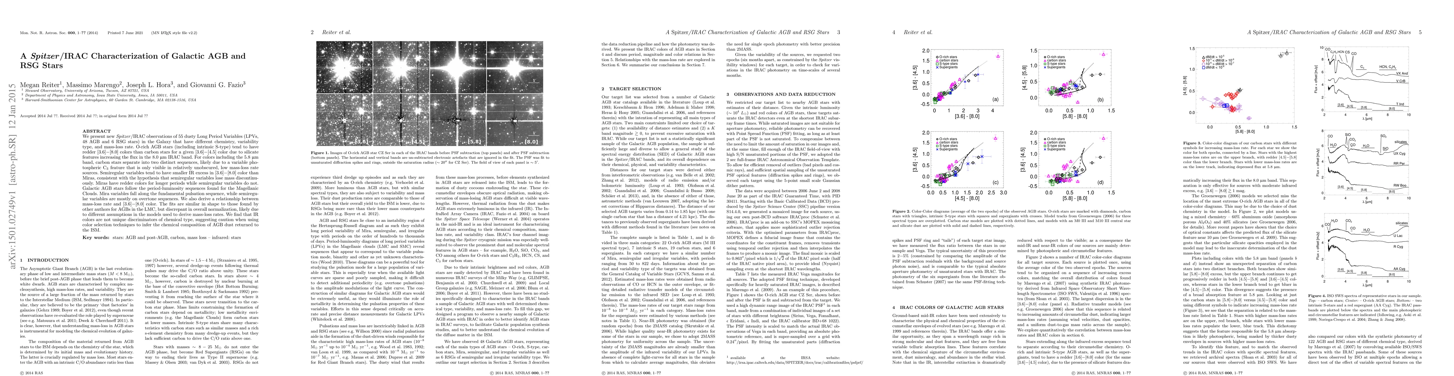 This paper uses Spitzer/IRAC observations to characterize Galactic AGB and RSG stars, revealing differences in IR colors due to silicate features and carbon star sequences. It finds that semiregular variables lose mass discontinuously and have less IR excess than Miras, and discusses the period-luminosity relationships and mass-loss rate correlations, cautioning against using IR colors alone to infer chemical compositions.