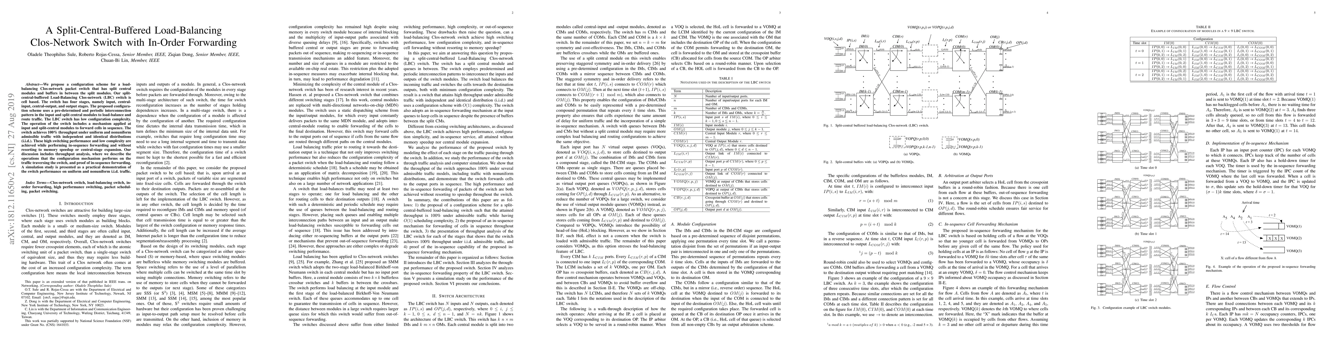 The paper proposes a configuration scheme for a load-balancing Clos-network packet switch with split central modules and buffers, utilizing a pre-determined and periodic interconnection pattern for traffic load balancing and routing. The proposed LBC switch is cell-based with four stages: input, central-input, central-output, and output.