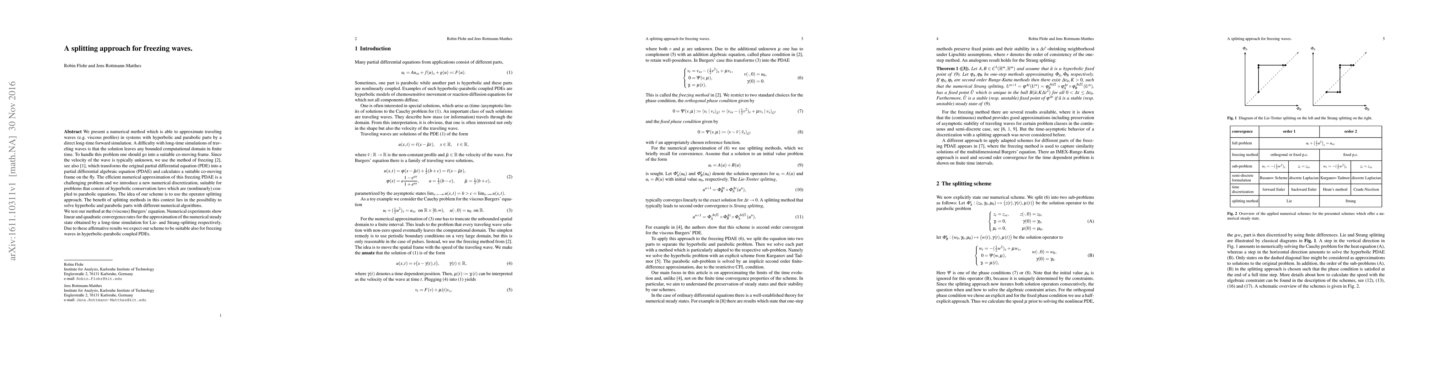We present a numerical method which is able to approximate traveling waves (e.g. viscous profiles) in systems with hyperbolic and parabolic parts by a direct long-time forward simulation. A difficulty with long-time simulations of traveling waves is that the solution leaves any bounded computational domain in finite time. To handle this problem one should go into a suitable co-moving frame. Since the velocity of the wave is typically unknown, we use the method of freezing [Beyn, Th\"ummler 2004], see also [Beyn, Otten, Rottmann-Matthes 2014], which transforms the original partial differential equation (PDE) into a partial differential algebraic equation (PDAE) and calculates a suitable co-moving frame on the fly. The efficient numerical approximation of this freezing PDAE is a challenging problem and we introduce a new numerical discretization, suitable for problems that consist of hyperbolic conservation laws which are (nonlinearly) coupled to parabolic equations. The idea of our scheme is to use the operator splitting approach. The benefit of splitting methods in this context lies in the possibility to solve hyperbolic and parabolic parts with different numerical algorithms. We test our method at the (viscous) Burgers' equation. Numerical experiments show linear and quadratic convergence rates for the approximation of the numerical steady state obtained by a long-time simulation for Lie- and Strang-splitting, respectively. Due to these affirmative results we expect our scheme to be suitable also for freezing waves in hyperbolic-parabolic coupled PDEs.