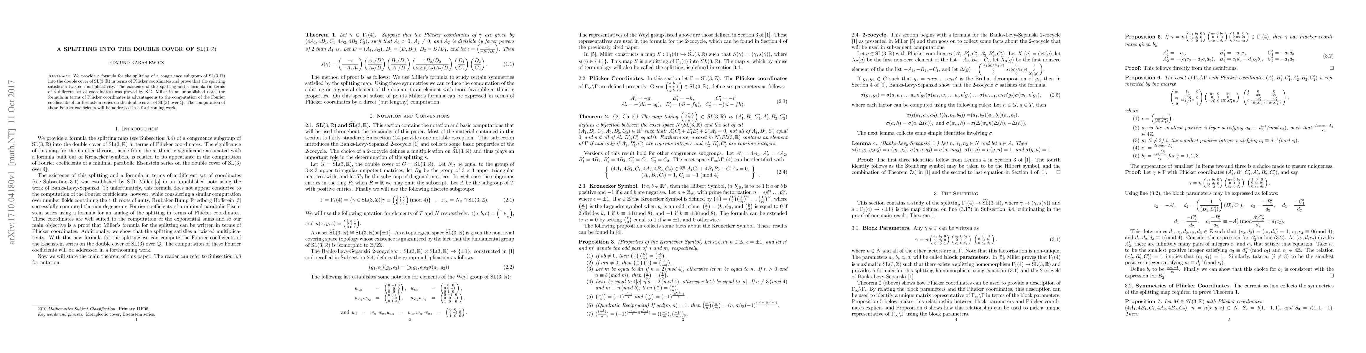 We provide a formula for the splitting of a congruence subgroup of SL$(3,\mathbb{R})$ into the double cover of SL$(3,\mathbb{R})$ in terms of Pl\"{u}cker coordinates and prove that the splitting satisfies a twisted multiplicativity. The existence of this splitting and a formula (in terms of a different set of coordinates) was proved by S.D. Miller in an unpublished note; the formula in terms of Pl\"{u}cker coordinates is advantageous to the computation of the Fourier coefficients of an Eisenstein series on the double cover of SL$(3)$ over $\mathbb{Q}$. The computation of these Fourier coefficients will be addressed in a forthcoming work.