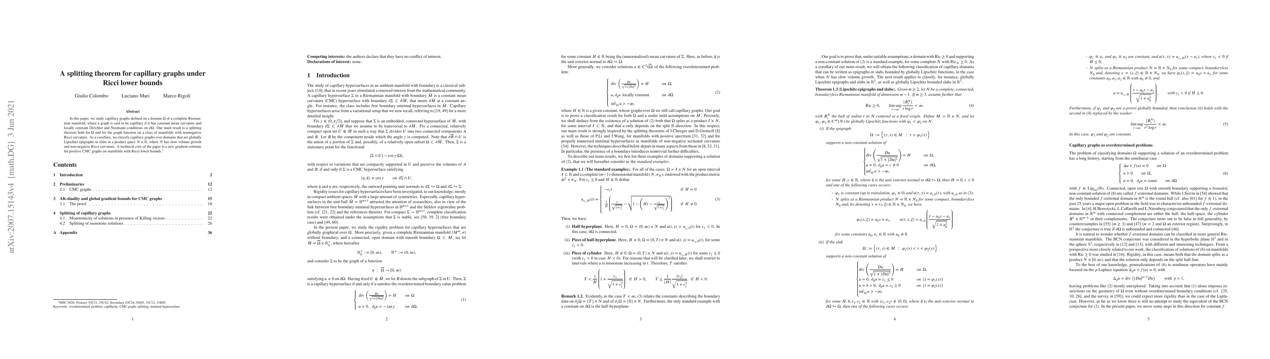 In this paper, we study capillary graphs defined on a domain $\Omega$ of a complete Riemannian manifold $M$, where a graph is said to be capillary if it has constant mean curvature and locally constant Dirichlet and Neumann conditions on $\partial \Omega$. Our main result is a splitting theorem both for $\Omega$ and for the graph function on a class of manifolds with nonnegative Ricci curvature. As a corollary, we classify capillary graphs over domains that are globally Lipschitz epigraphs or slabs in a product space $M = N \times \mathbb{R}$, where $N$ has slow volume growth and non-negative Ricci curvature, including the case $M = \mathbb{R}^2,\mathbb{R}^3$. A technical core of the paper is a new gradient estimate for positive CMC graphs on manifolds with Ricci lower bounds.