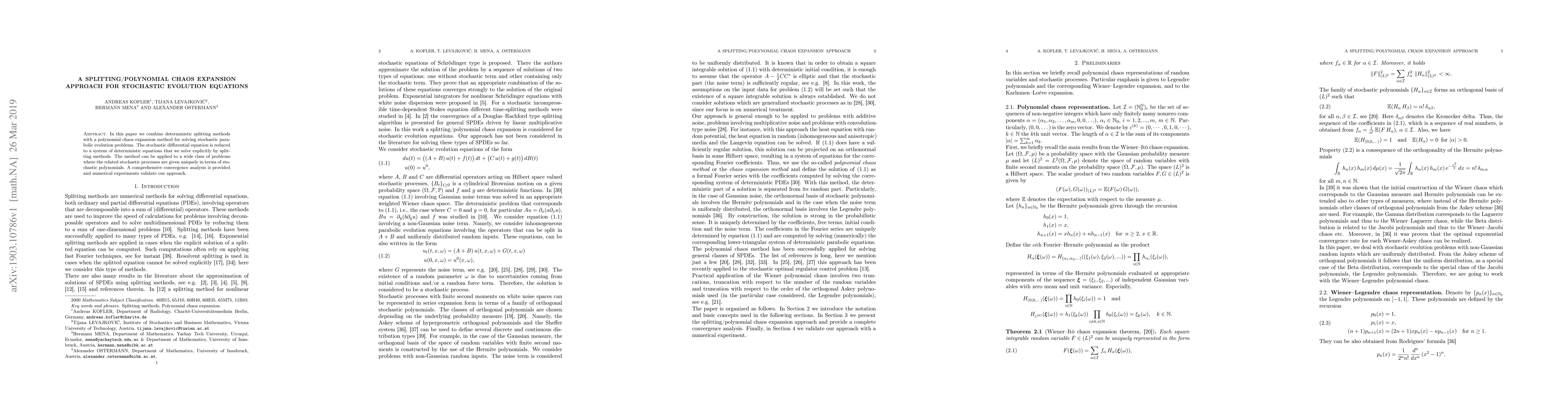 This paper combines deterministic splitting methods with polynomial chaos expansion to solve stochastic parabolic evolution equations, reducing the stochastic differential equation to a system of deterministic equations. The method is validated through numerical experiments and convergence analysis.