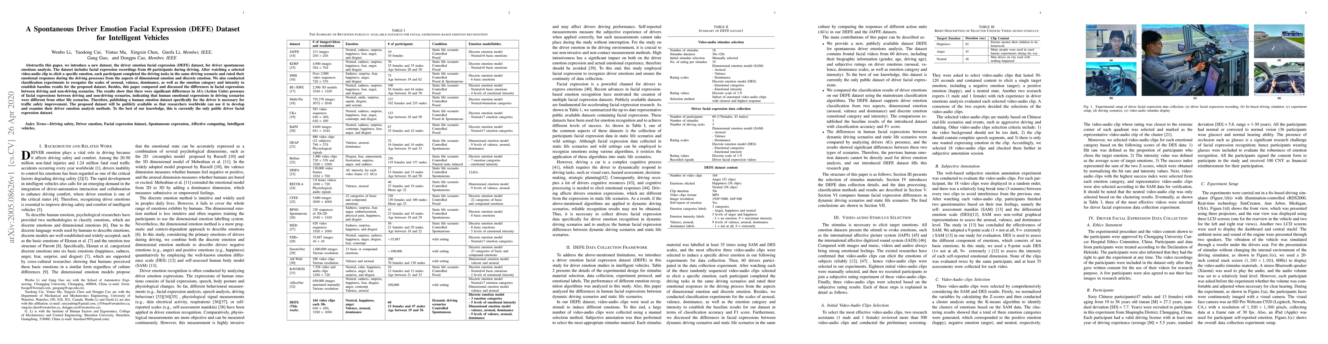 This paper introduces a new DEFE dataset for analyzing spontaneous driver emotions through facial expressions, featuring recordings from 60 participants. The study highlights significant differences in emotional expressions between driving and non-driving scenarios, underscoring the importance of a dedicated driver emotion dataset for traffic safety.