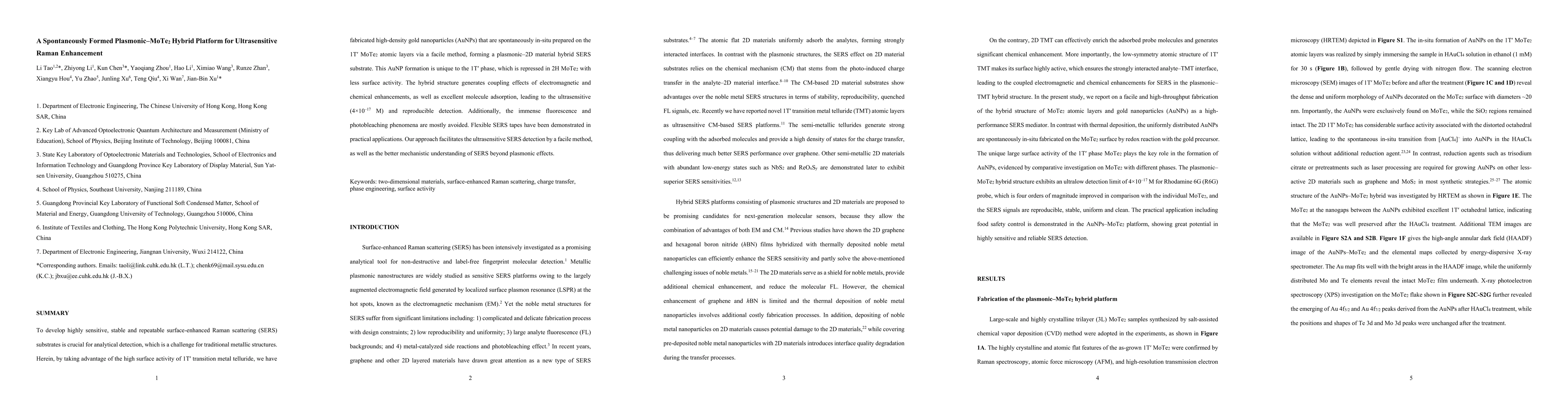 The paper reports the development of a plasmonic-MoTe2 hybrid platform for ultrasensitive Raman enhancement, using high-density gold nanoparticles on 1T' MoTe2 layers to create a stable SERS substrate with electromagnetic and chemical enhancements, achieving detection sensitivity of 4 x 10^-17 M. The method avoids fluorescence and photobleaching issues, and demonstrates practical applications with flexible SERS tapes.