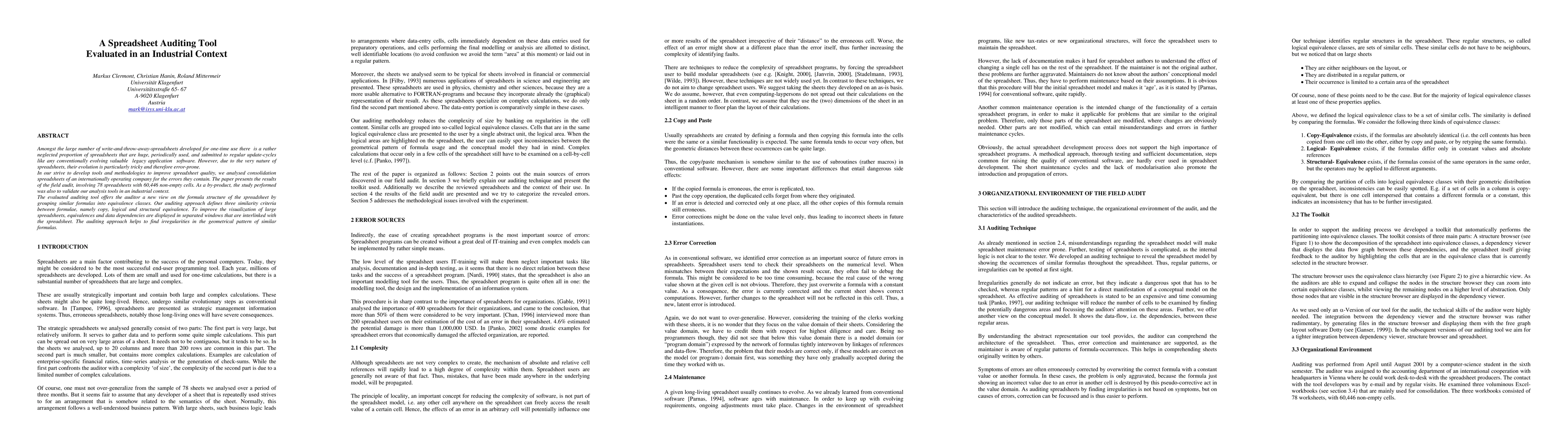 This paper evaluates a spreadsheet auditing tool in an industrial setting, analyzing 78 large, periodically updated spreadsheets to identify errors. The tool groups similar formulas into equivalence classes to improve the visualization and detection of irregularities in large spreadsheets.