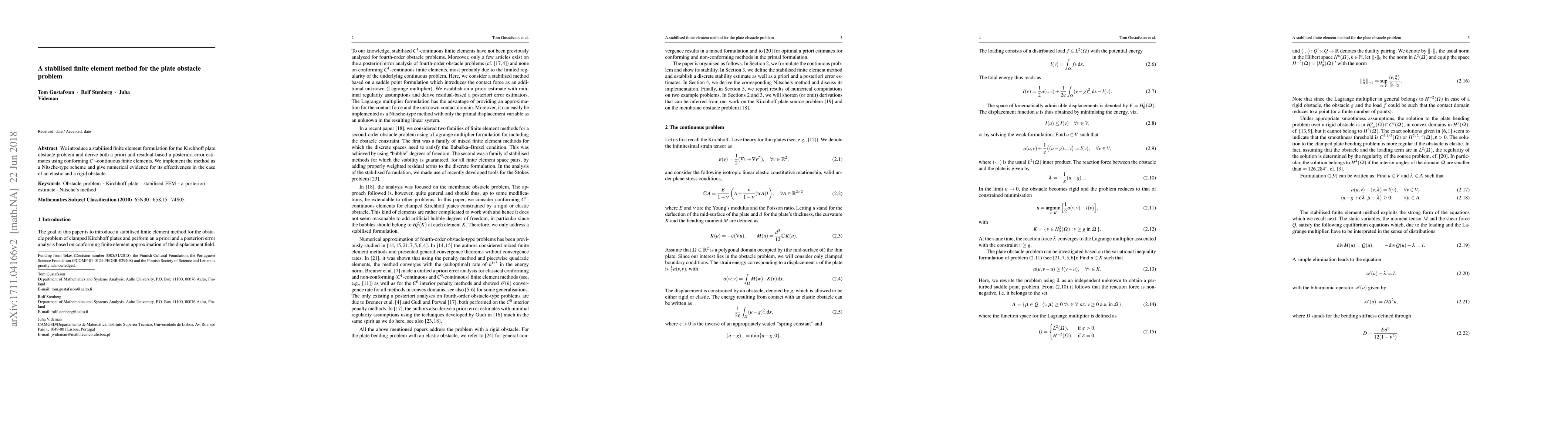 This paper presents a stabilised finite element method for the Kirchhoff plate obstacle problem, employing a Nitsche-type scheme with $C^1$-continuous elements, and provides both a priori and residual-based a posteriori error estimates, demonstrating its effectiveness through numerical simulations involving elastic and rigid obstacles.
