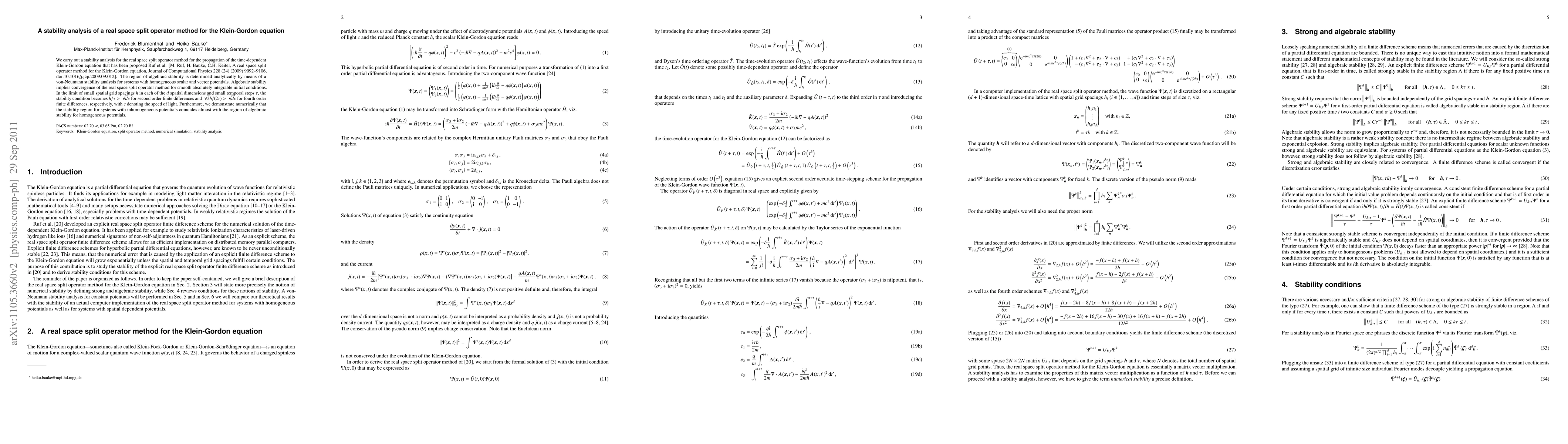 A stability analysis for the real space split operator method of the Klein-Gordon equation shows that small spatial grid spacings and temporal steps are required for stability, with specific conditions depending on the order of finite differences used.