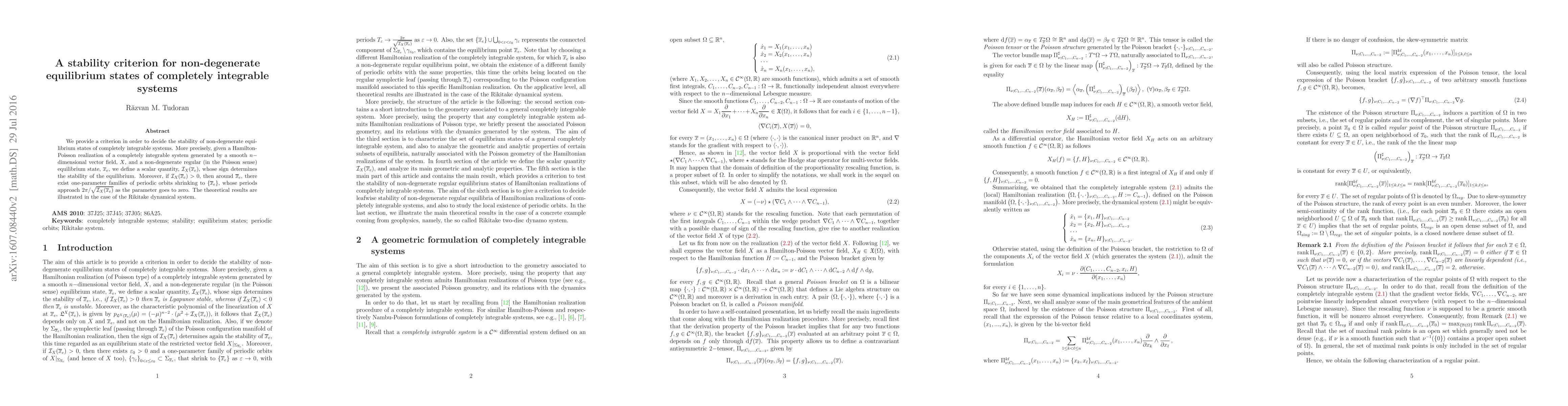This paper introduces a stability criterion for non-degenerate equilibrium states in completely integrable systems, which determines stability based on the scalar quantity $ extit{I}_X( extit{ extoverline{x}}_e)$.