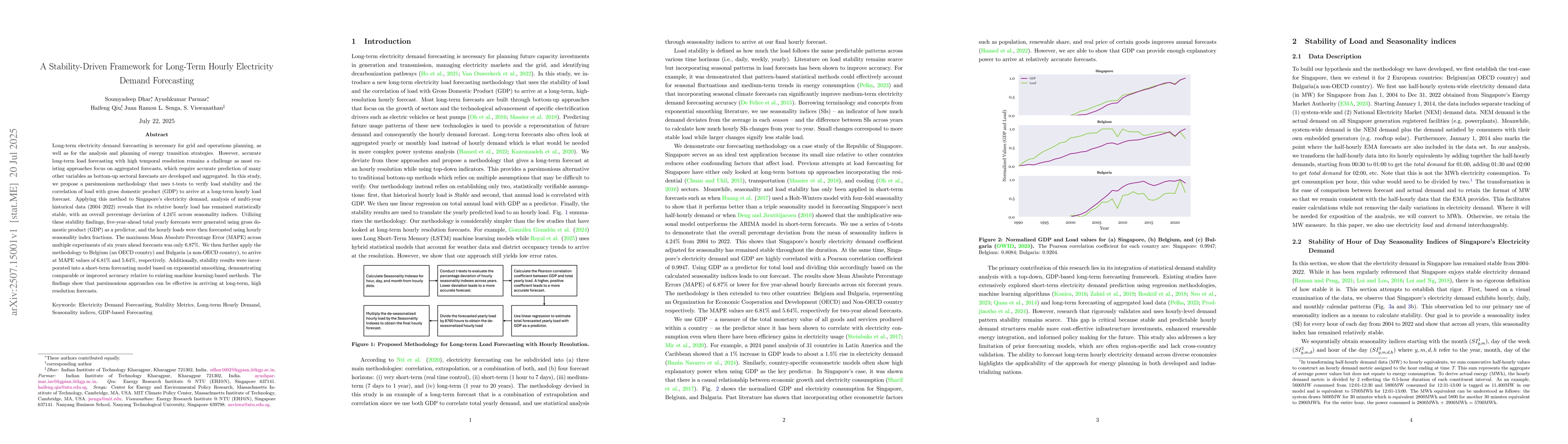 This research introduces a stability-driven framework for long-term hourly electricity demand forecasting, using t-tests to verify load stability and GDP correlation. Applied to Singapore, Belgium, and Bulgaria, it achieved MAPE values of 6.87%, 6.81%, and 5.64% respectively, demonstrating parsimonious methods' effectiveness for high-resolution forecasting.