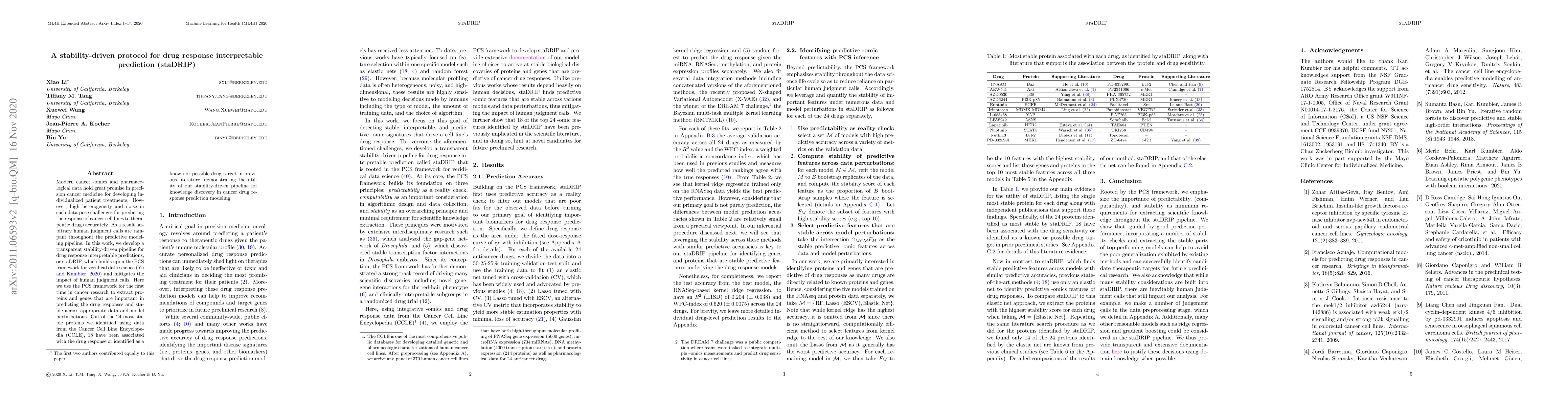 The paper introduces staDRIP, a stability-driven protocol that leverages the PCS framework to predict cancer cell line responses to drugs with reduced reliance on human judgment. The method identifies stable proteins and genes associated with drug response, demonstrating its potential for knowledge discovery in precision cancer medicine.