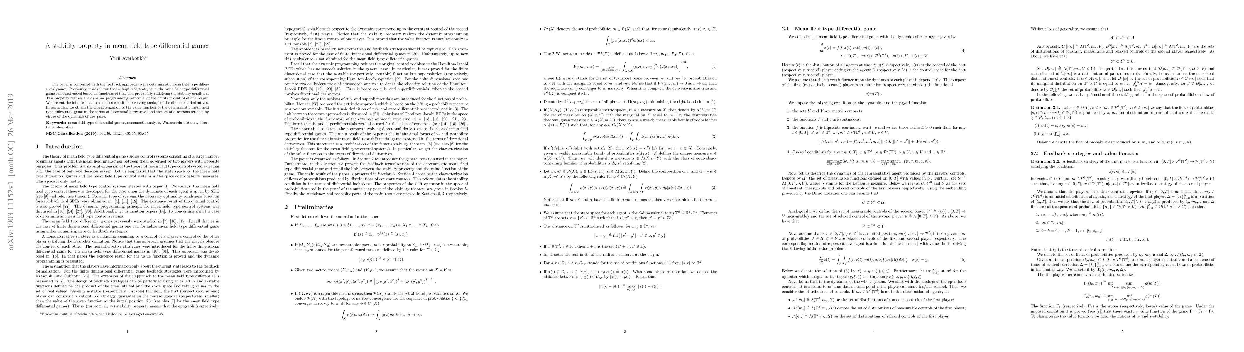 The paper is concerned with the feedback approach to the deterministic mean field type differential games. Previously, it was shown that suboptimal strategies in the mean field type differential game can constructed based on functions of time and probability satisfying the stability condition. This property realizes the dynamic programming principle for the constant control of one player. We present the infinitesimal form of this condition involving analogs of the directional derivatives. In particular, we obtain the characterization of the value function of the deterministic mean field type differential game in the terms of directional derivatives and the set of directions feasible by virtue of the dynamics of the game.