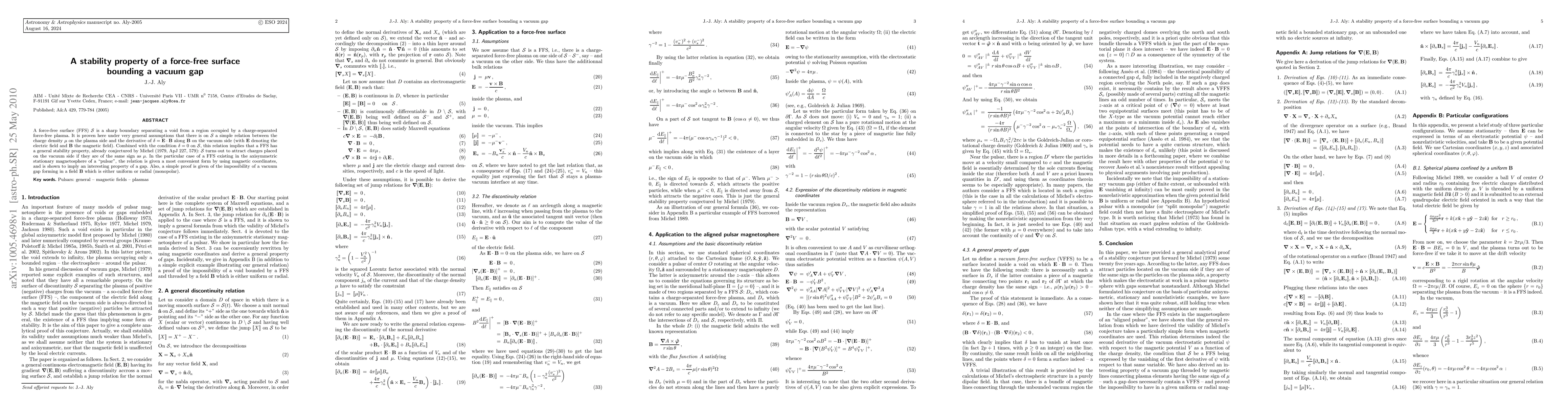 A force-free surface (FFS) ${\cal S}$ is a sharp boundary separating a void from a region occupied by a charge-separated force-free plasma. It is proven here under very general assumptions that there is on ${\cal S}$ a simple relation between the charge density $\mu$ on the plasma side and the derivative of $\delta=\E\cdot\B$ along $\B$ on the vacuum side (with $\E$ denoting the electric field and $\B$ the magnetic field). Combined with the condition $\delta=0$ on ${\cal S}$, this relation implies that a FFS has a general stability property, already conjectured by Michel (1979, ApJ 227, 579): ${\cal S}$ turns out to attract charges placed on the vacuum side if they are of the same sign as $\mu$. In the particular case of a FFS existing in the axisymmetric stationary magnetosphere of a "pulsar", the relation is given a most convenient form by using magnetic coordinates, and is shown to imply an interesting property of a gap. Also, a simple proof is given of the impossibility of a vacuum gap forming in a field $\B$ which is either uniform or radial (monopolar).