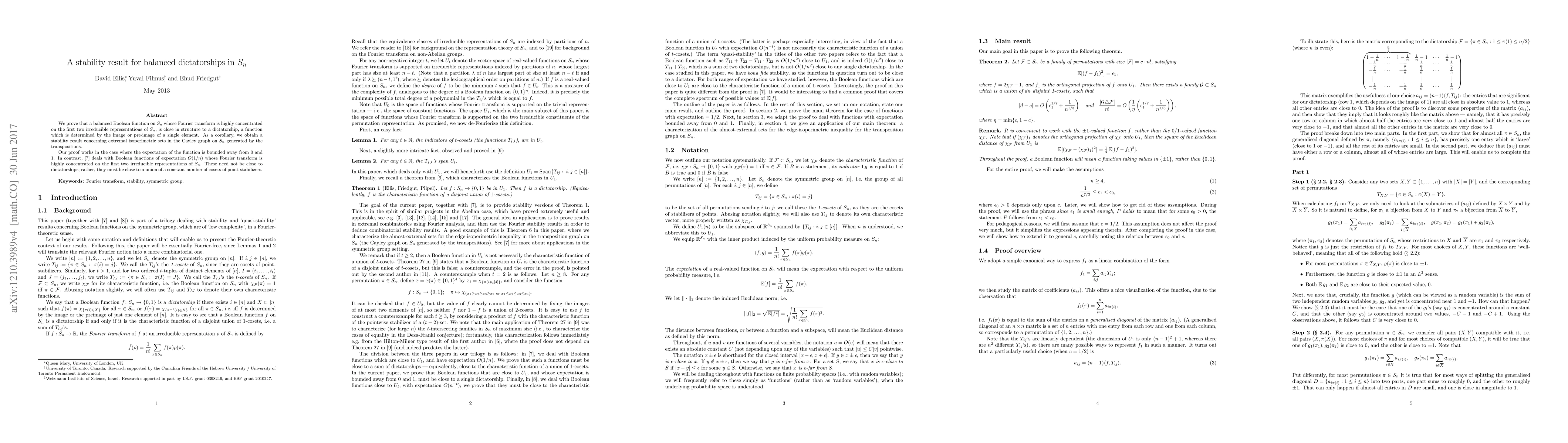 We prove that a balanced Boolean function on $S_{n}$ whose Fourier transform is highly concentrated on the first two irreducible representations of $S_{n}$, is close in structure to a dictatorship, a function which is determined by the image or pre-image of a single element. As a corollary, we obtain a stability result concerning extremal isoperimetric sets in the Cayley graph on $S_{n}$ generated by the transpositions. Our proof works in the case where the expectation of the function is bounded away from $0$ and $1$. In contrast, [Ellis, D., Filmus, Y., Friedgut, E., A quasi-stability result for dictatorships in $S_{n}$, Combinatorica 35 (2015), pp. 573-618] deals with Boolean functions of expectation O(1/n) whose Fourier transform is highly concentrated on the first two irreducible representations of $S_{n}$. These need not be close to dictatorships; rather, they must be close to a union of a constant number of cosets of point-stabilizers.
