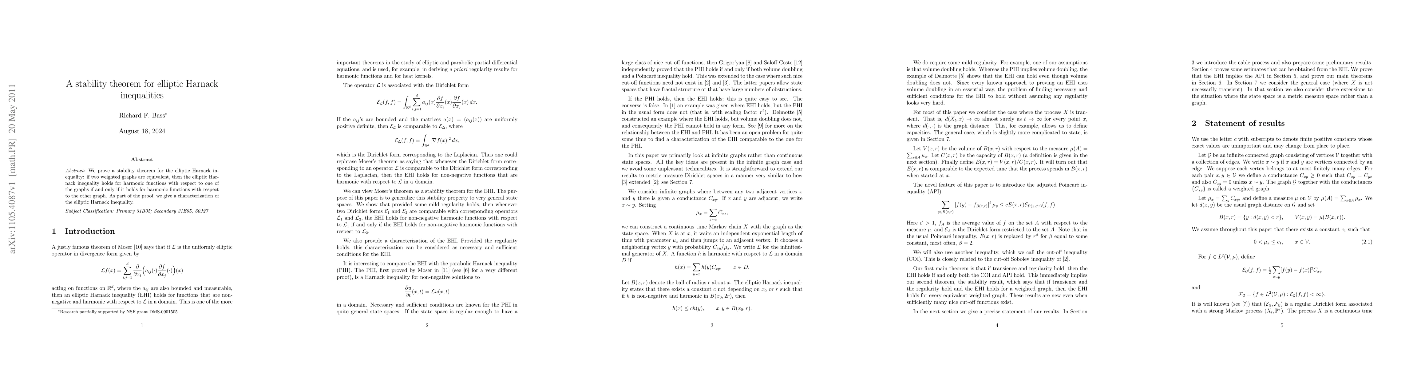 This paper establishes a stability theorem for elliptic Harnack inequalities in weighted graphs, showing that the inequality holds for harmonic functions relative to one graph if and only if it does for the other, provided the graphs are equivalent. The proof includes a detailed characterization of the elliptic Harnack inequality.