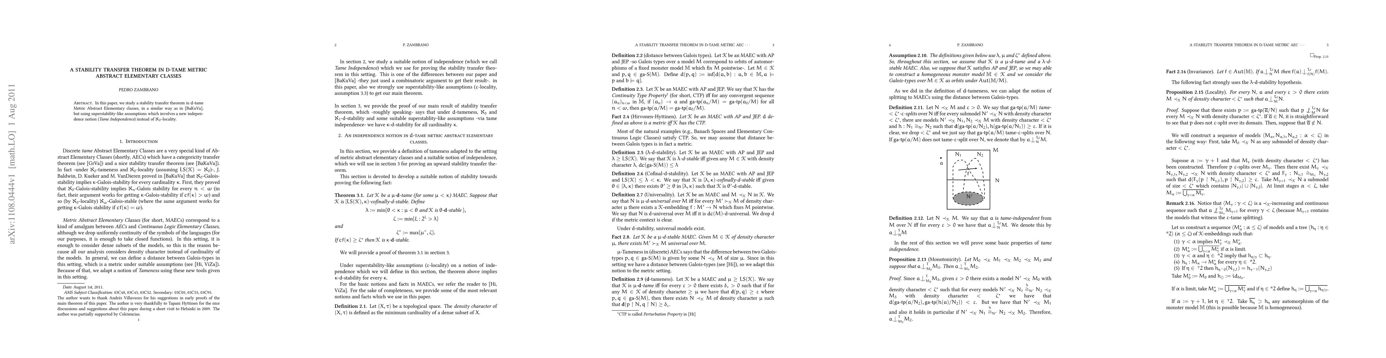 This paper investigates a stability transfer theorem within d-tame Metric Abstract Elementary Classes, employing superstability-like assumptions and introducing a new independence notion called Tame Independence, instead of relying on $\aleph_0$-locality.