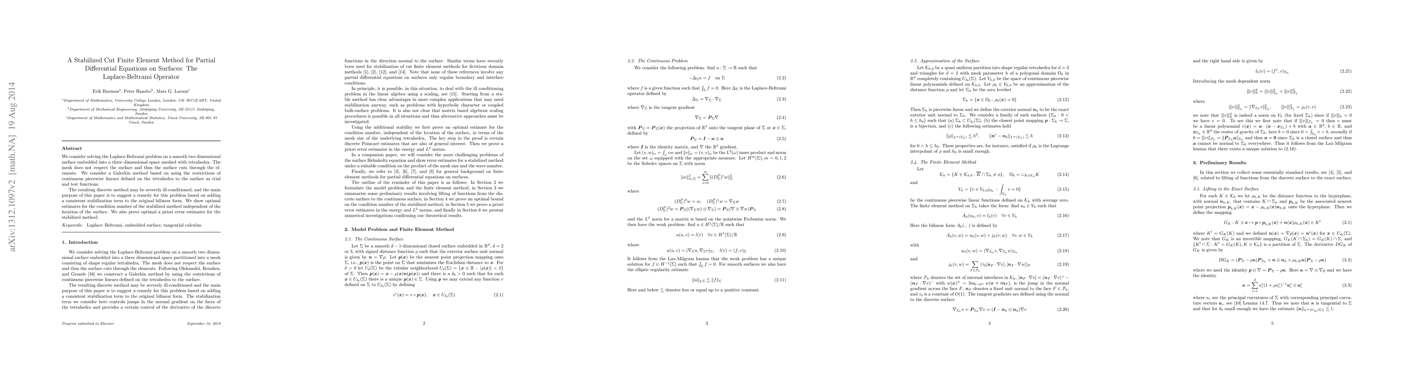 We consider solving the Laplace-Beltrami problem on a smooth two dimensional surface embedded into a three dimensional space meshed with tetrahedra. The mesh does not respect the surface and thus the surface cuts through the elements. We consider a Galerkin method based on using the restrictions of continuous piecewise linears defined on the tetrahedra to the surface as trial and test functions. The resulting discrete method may be severely ill-conditioned, and the main purpose of this paper is to suggest a remedy for this problem based on adding a consistent stabilization term to the original bilinear form. We show optimal estimates for the condition number of the stabilized method independent of the location of the surface. We also prove optimal a priori error estimates for the stabilized method.