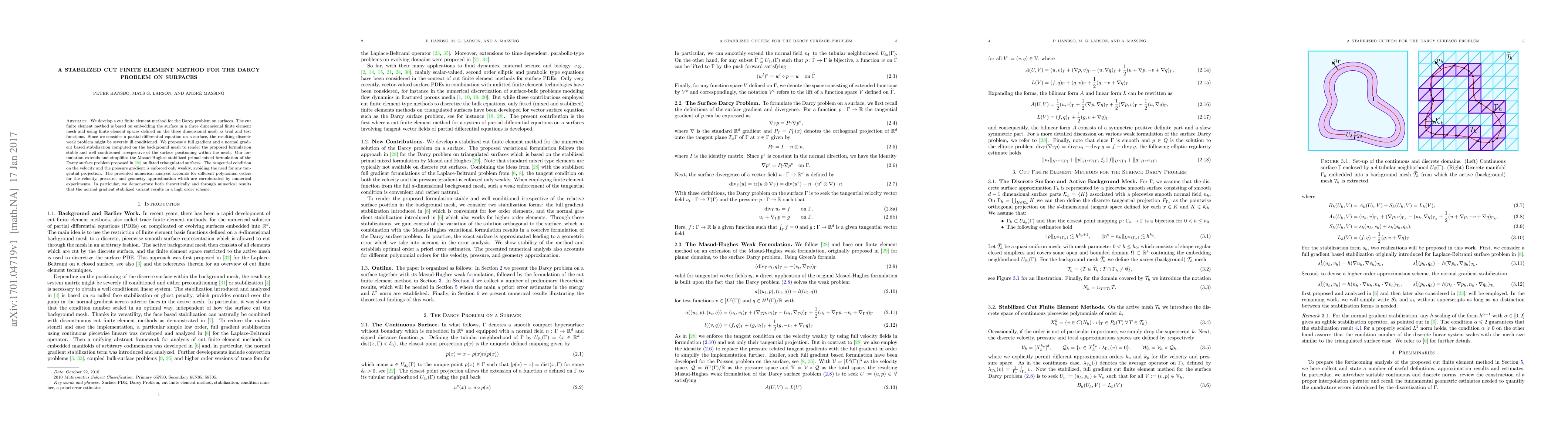 This paper introduces a stabilized cut finite element method for solving the Darcy problem on surfaces, embedding the surface in a 3D mesh and using stabilization techniques to ensure stability and well-conditioning. The method simplifies previous formulations and achieves high-order accuracy, particularly with normal gradient stabilization.