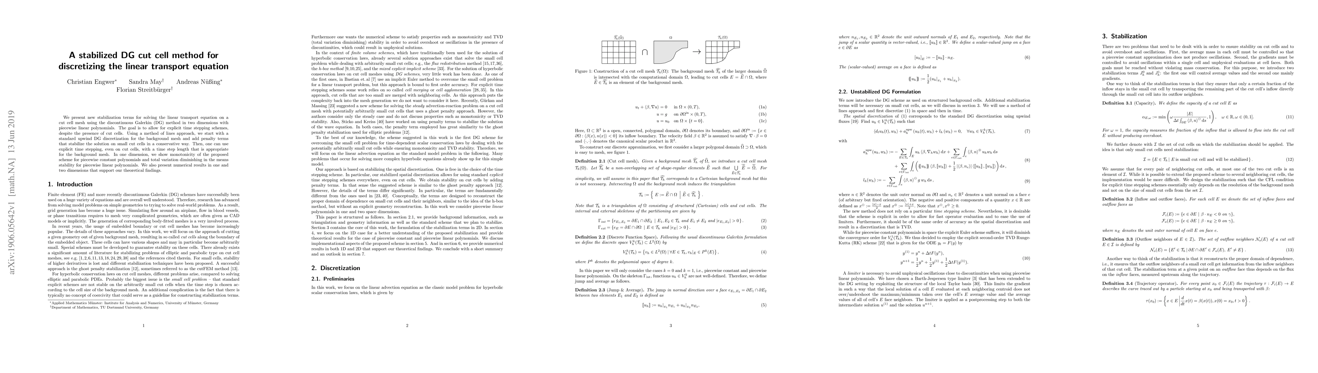We present new stabilization terms for solving the linear transport equation on a cut cell mesh using the discontinuous Galerkin (DG) method in two dimensions with piecewise linear polynomials. The goal is to allow for explicit time stepping schemes, despite the presence of cut cells. Using a method of lines approach, we start with a standard upwind DG discretization for the background mesh and add penalty terms that stabilize the solution on small cut cells in a conservative way. Then, one can use explicit time stepping, even on cut cells, with a time step length that is appropriate for the background mesh. In one dimension, we show monotonicity of the proposed scheme for piecewise constant polynomials and total variation diminishing in the means stability for piecewise linear polynomials. We also present numerical results in one and two dimensions that support our theoretical findings.