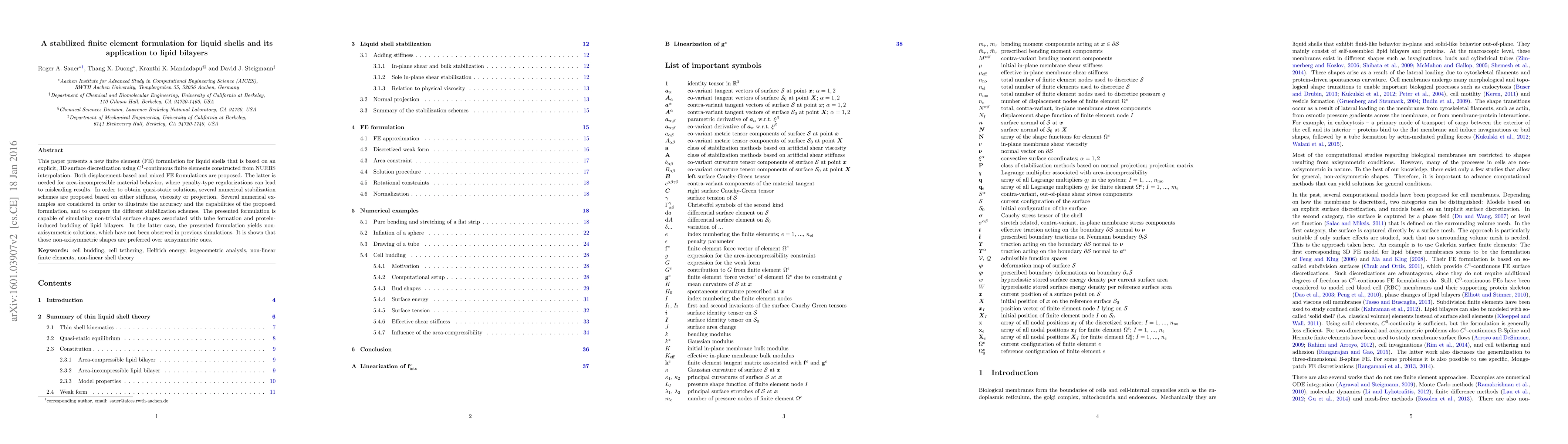 This paper presents a new finite element (FE) formulation for liquid shells that is based on an explicit, 3D surface discretization using $C^1$-continuous finite elements constructed from NURBS interpolation. Both displacement-based and mixed FE formulations are proposed. The latter is needed for area-incompressible material behavior, where penalty-type regularizations can lead to misleading results. In order to obtain quasi-static solutions, several numerical stabilization schemes are proposed based on either stiffness, viscosity or projection. Several numerical examples are considered in order to illustrate the accuracy and the capabilities of the proposed formulation, and to compare the different stabilization schemes. The presented formulation is capable of simulating non-trivial surface shapes associated with tube formation and protein-induced budding of lipid bilayers. In the latter case, the presented formulation yields non-axisymmetric solutions, which have not been observed in previous simulations. It is shown that those non-axisymmetric shapes are preferred over axisymmetric ones.