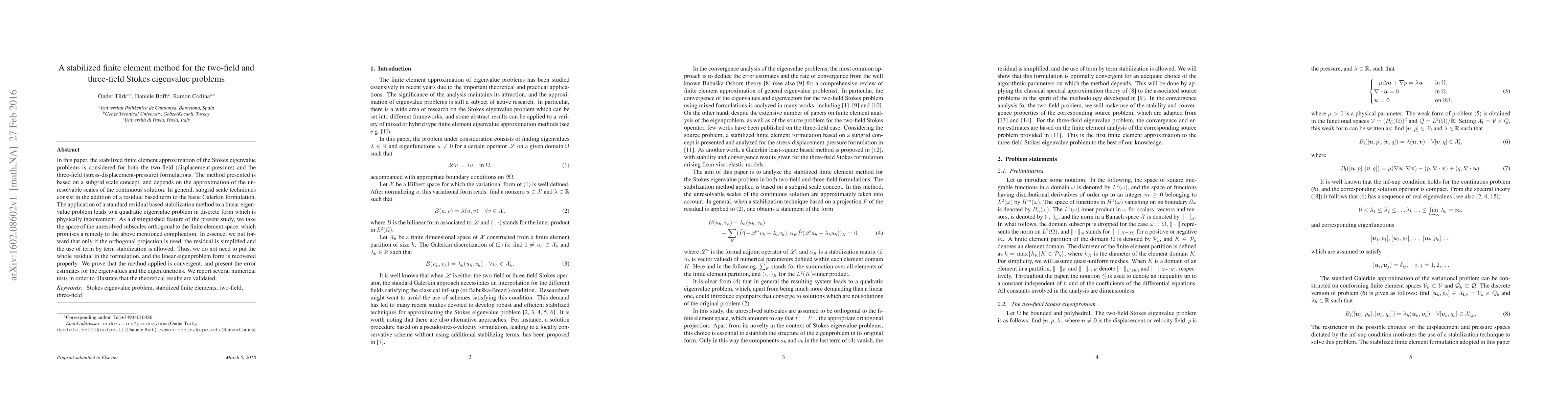 This paper proposes a stabilized finite element method for solving the Stokes eigenvalue problems in both two-field and three-field formulations, employing a subgrid scale concept. The method simplifies the residual and maintains the linear eigenvalue problem form by using orthogonal projection of unresolved subscales, ensuring convergence and providing error estimates. Numerical tests validate the theoretical results.
