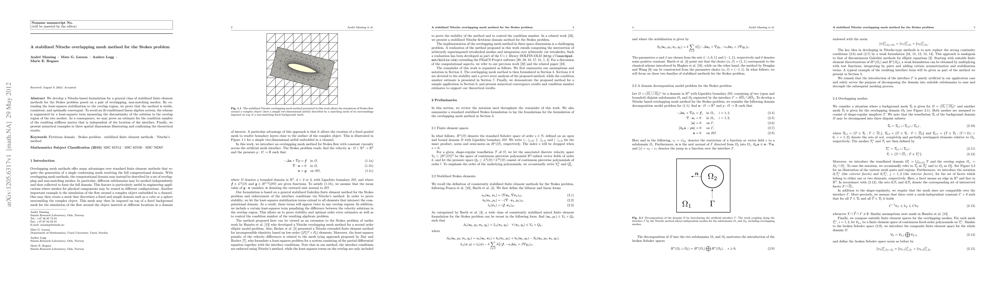 This paper introduces a Nitsche-based stabilized finite element method for the Stokes problem on overlapping, non-matching meshes, proving stability, consistency, and optimal convergence. The method includes a least-squares term to handle solution discontinuities, ensuring an independent condition number of the stiffness matrix from the interface location, and is validated through three-dimensional numerical examples.