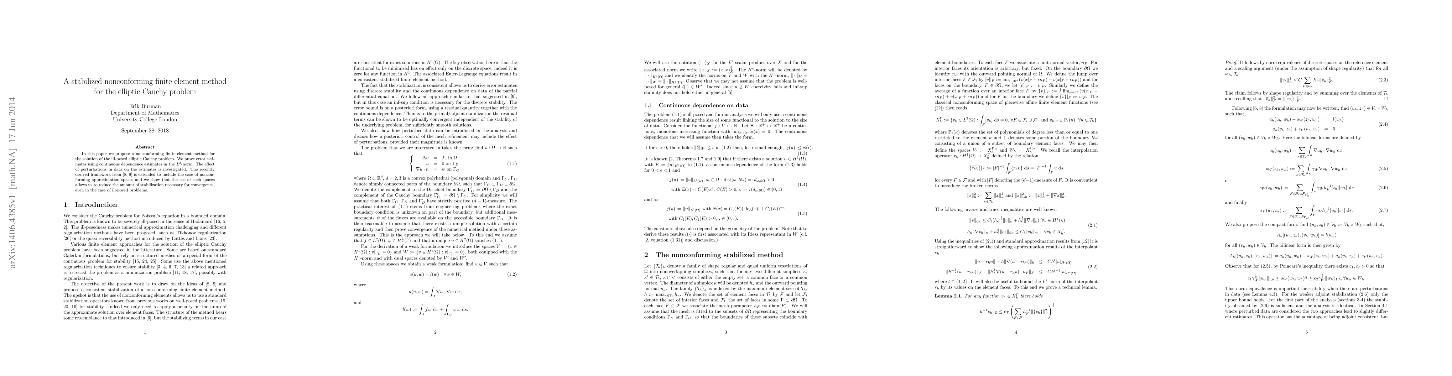 This paper proposes a nonconforming finite element method for solving the ill-posed elliptic Cauchy problem, demonstrating error estimates and reduced stabilization through continuous dependence estimates in the $L^2$-norm. The method leverages a recently derived framework to effectively manage data perturbations.
