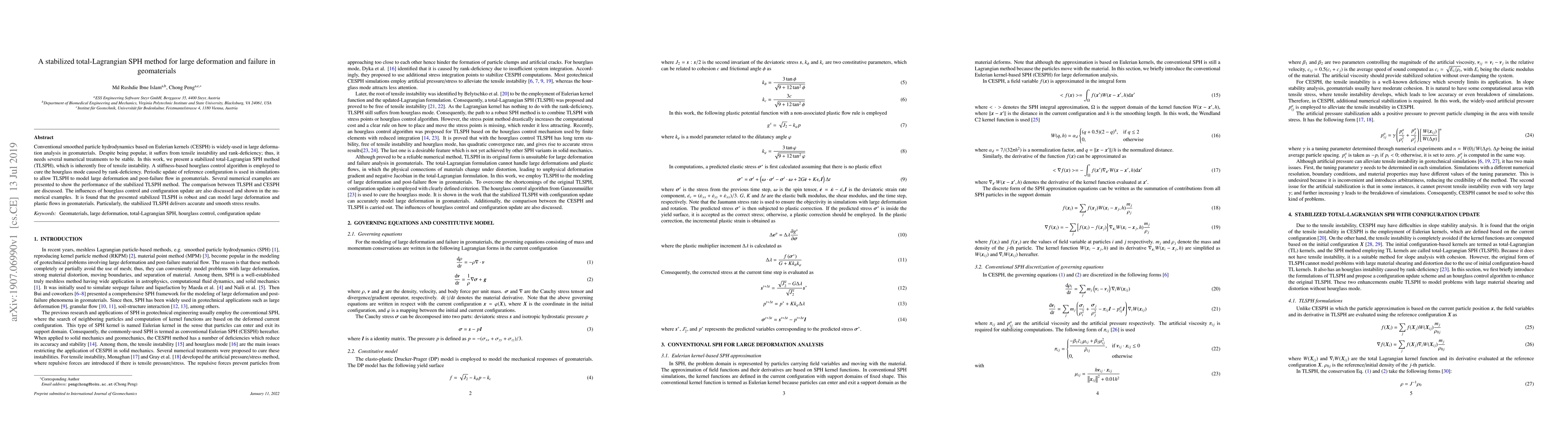 This paper introduces a stabilized total-Lagrangian SPH method (TLSPH) to address tensile instability and rank-deficiency in conventional smoothed particle hydrodynamics (CESPH) for large deformation in geomaterials. The method employs stiffness-based hourglass control and periodic reference configuration updates, demonstrating robust performance and accurate stress results in numerical simulations.