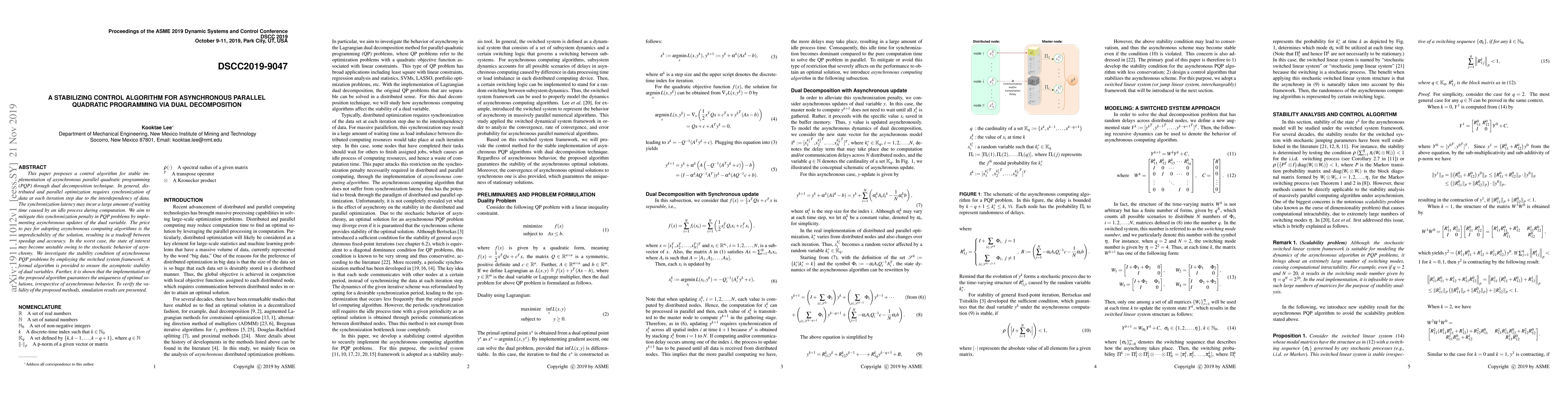 This paper proposes a control algorithm to stabilize asynchronous parallel quadratic programming via dual decomposition, addressing the synchronization penalty and ensuring asymptotic stability and uniqueness of optimal solutions despite asynchrony. Simulation results validate the effectiveness of the proposed method.
