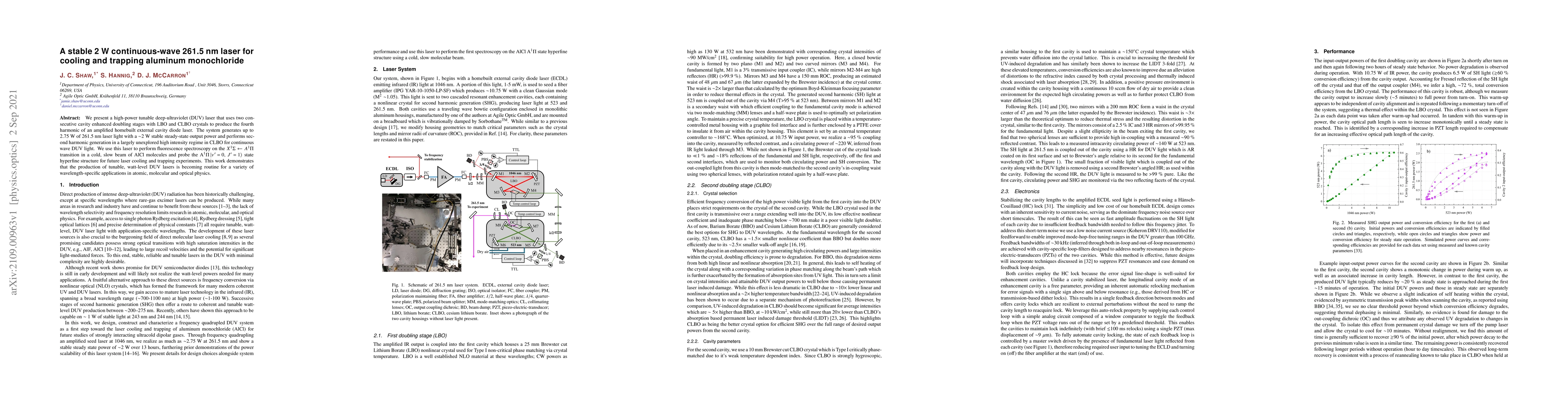 This paper describes a high-power, tunable deep-ultraviolet laser generating up to 2.75 W of 261.5 nm light, enabling fluorescence spectroscopy on AlCl molecules for potential laser cooling and trapping applications. The laser employs cavity-enhanced doubling to achieve stable continuous-wave output.