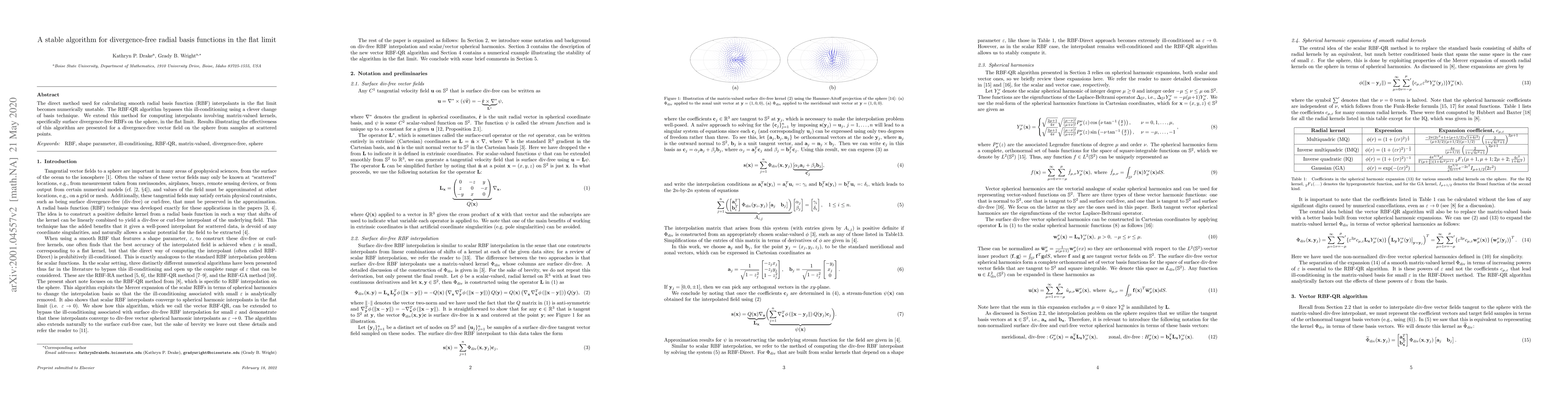 This paper presents a stable algorithm, the RBF-QR method, for computing divergence-free radial basis function interpolants in the flat limit, addressing numerical instability issues. The method is extended to matrix-valued kernels and demonstrated through effective interpolation of a divergence-free vector field on the sphere.