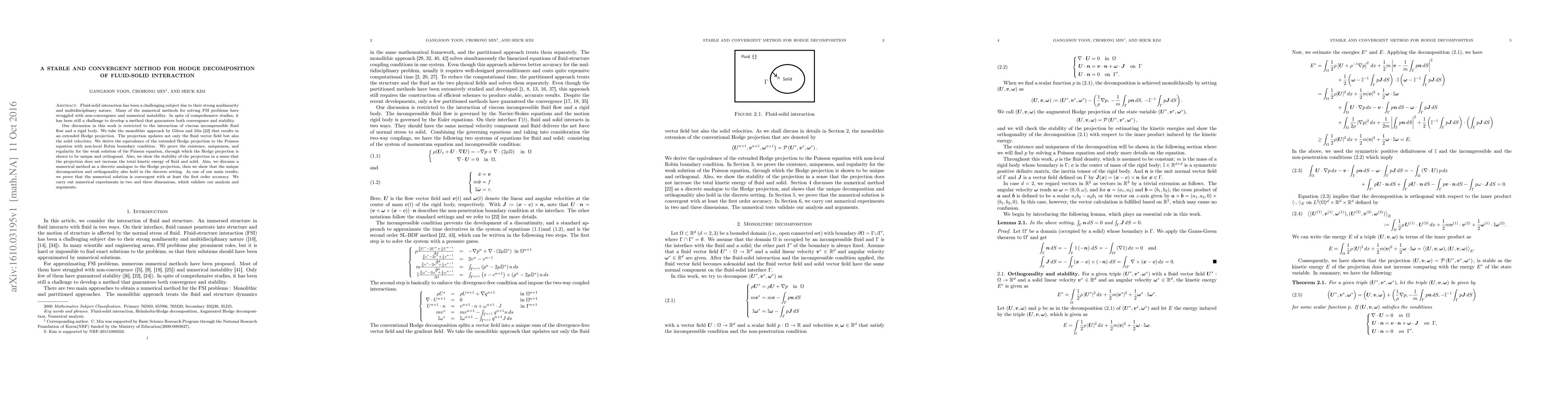 This paper presents a stable and convergent method for the Hodge decomposition of fluid-solid interaction, proving the existence, uniqueness, and orthogonality of the projection. The method guarantees stability and first-order convergence, validated through numerical experiments in both 2D and 3D.