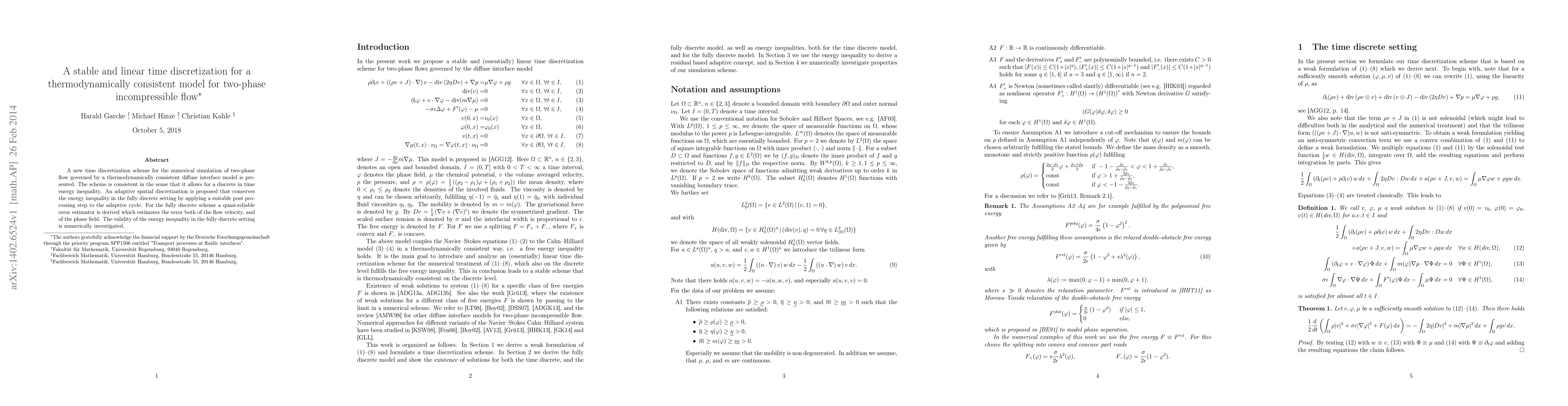 A new time discretization scheme for the numerical simulation of two-phase flow governed by a thermodynamically consistent diffuse interface model is presented. The scheme is consistent in the sense that it allows for a discrete in time energy inequality. An adaptive spatial discretization is proposed that conserves the energy inequality in the fully discrete setting by applying a suitable post processing step to the adaptive cycle. For the fully discrete scheme a quasi-reliable error estimator is derived which estimates the error both of the flow velocity, and of the phase field. The validity of the energy inequality in the fully discrete setting is numerically investigated.