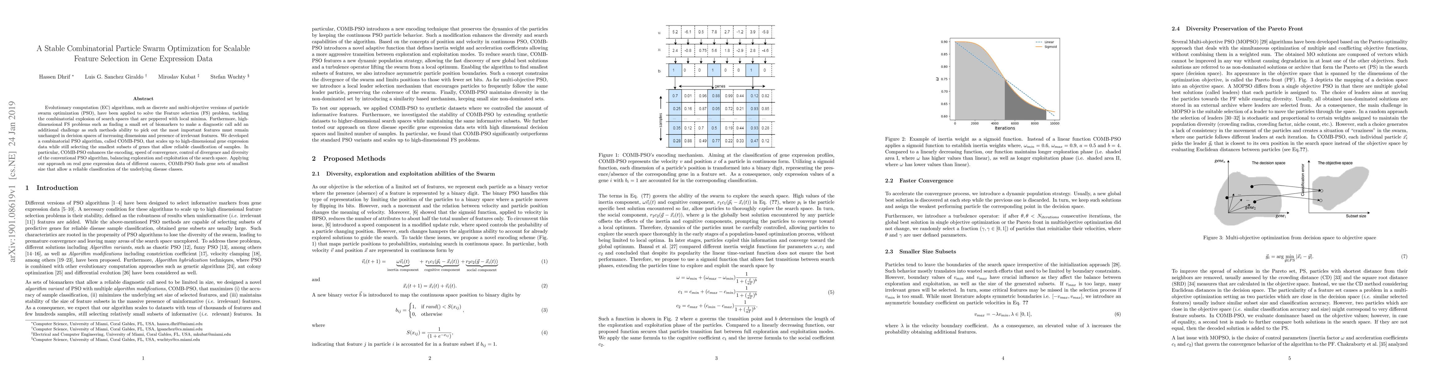 Evolutionary computation (EC) algorithms, such as discrete and multi-objective versions of particle swarm optimization (PSO), have been applied to solve the Feature selection (FS) problem, tackling the combinatorial explosion of search spaces that are peppered with local minima. Furthermore, high-dimensional FS problems such as finding a small set of biomarkers to make a diagnostic call add an additional challenge as such methods ability to pick out the most important features must remain unchanged in decision spaces of increasing dimensions and presence of irrelevant features. We developed a combinatorial PSO algorithm, called COMB-PSO, that scales up to high-dimensional gene expression data while still selecting the smallest subsets of genes that allow reliable classification of samples. In particular, COMB-PSO enhances the encoding, speed of convergence, control of divergence and diversity of the conventional PSO algorithm, balancing exploration and exploitation of the search space. Applying our approach on real gene expression data of different cancers, COMB-PSO finds gene sets of smallest size that allow a reliable classification of the underlying disease classes.