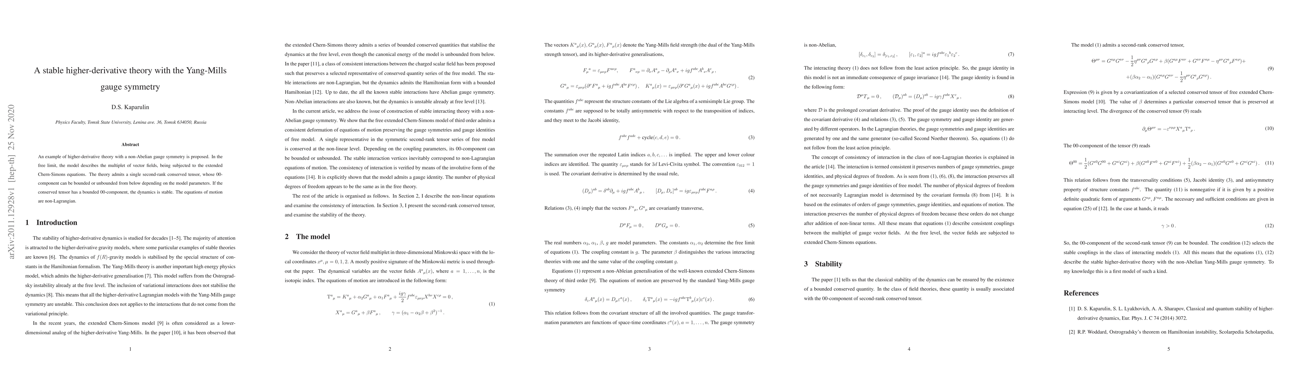An example of higher-derivative theory with a non-Abelian gauge symmetry is proposed. In the free limit, the model describes the multiplet of vector fields, being subjected to the extended Chern-Simons equations. The theory admits a single second-rank conserved tensor, whose 00-component can be bounded or unbounded from below depending on the model parameters. If the conserved tensor has a bounded 00-component, the dynamics is stable. The equations of motion are non-Lagrangian.