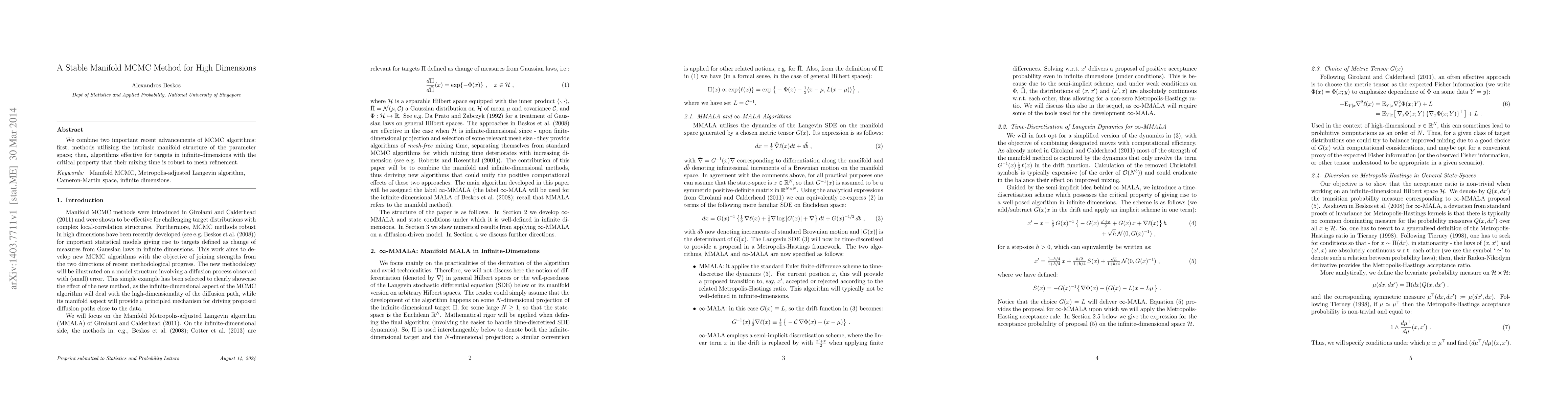We combine two important recent advancements of MCMC algorithms: first, methods utilizing the intrinsic manifold structure of the parameter space; then, algorithms effective for targets in infinite-dimensions with the critical property that their mixing time is robust to mesh refinement.