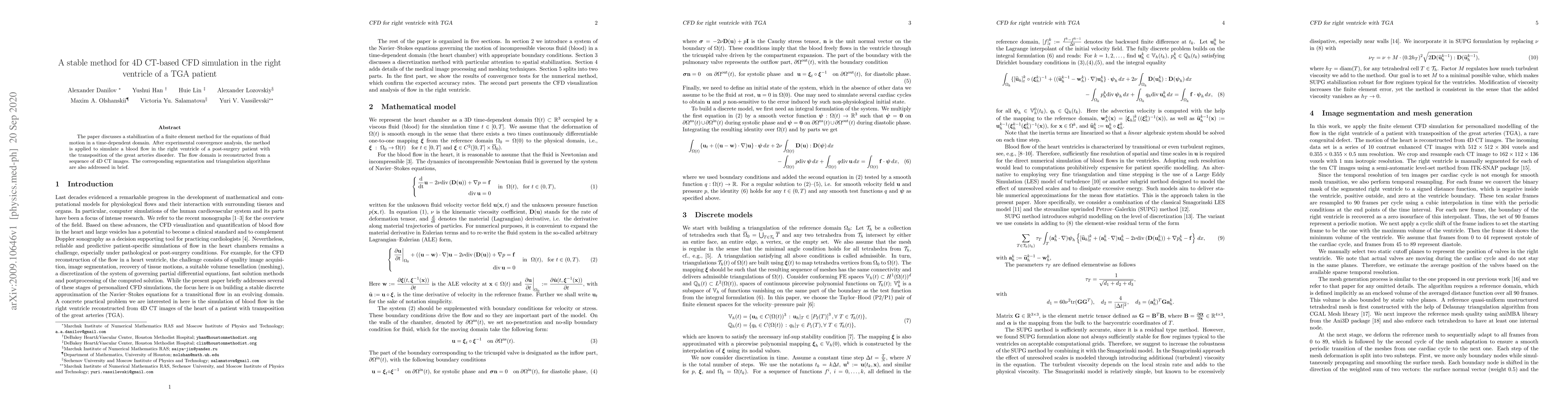 This paper presents a stabilized finite element method for simulating blood flow in the right ventricle of a post-surgery transposition of the great arteries patient, using 4D CT images for domain reconstruction, segmentation, and triangulation.