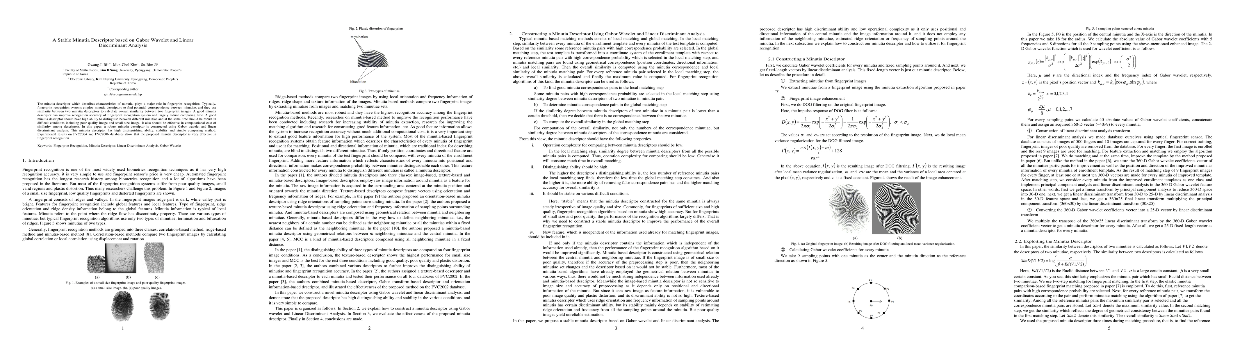 This paper proposes a robust minutia descriptor based on Gabor wavelet and linear discriminant analysis for fingerprint recognition, aiming to enhance distinguishing ability and computational efficiency. Experimental results demonstrate its effectiveness in improving recognition accuracy and reducing comparison time on FVC2004 and FVC2006 databases.